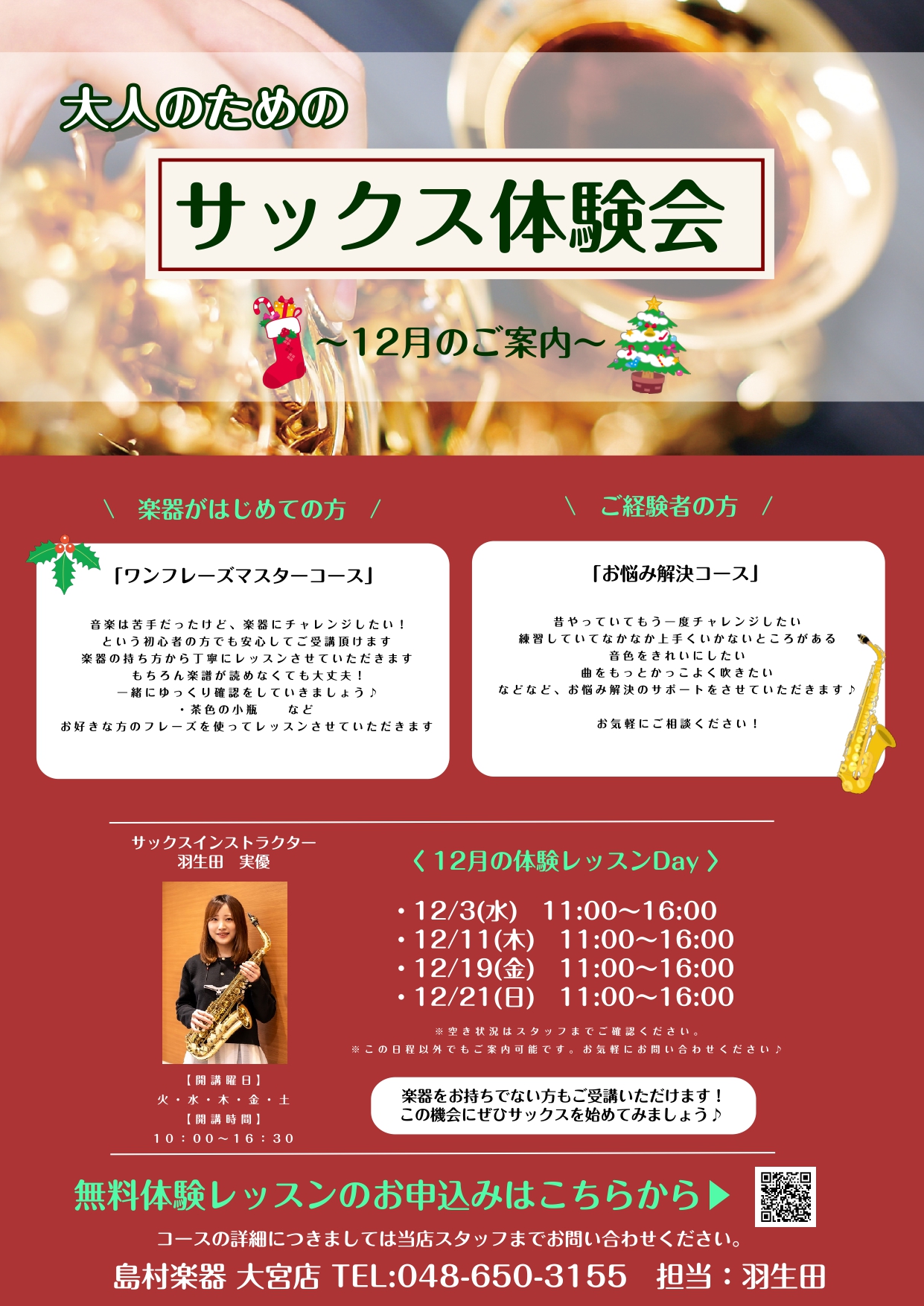 ![さいたま市大宮のみなさま、こんにちは!大宮店サックスインストラクターの羽生田です。寒い日が続いておりますね~⛄そんな日は温かい室内でサックスデビューしてみませんか♪ CONTENTSサックスを始めてみよう!まずは無料体験レッスン♪サックス体験レッスン空き状況(12/2~12/13)サックスインストラ […]](https://www.shimamura.co.jp/shop/ohmiya/wp-content/uploads/sites/25/2025/11/20251127-7259c08e5064a0acd799019a232320f9.jpg)