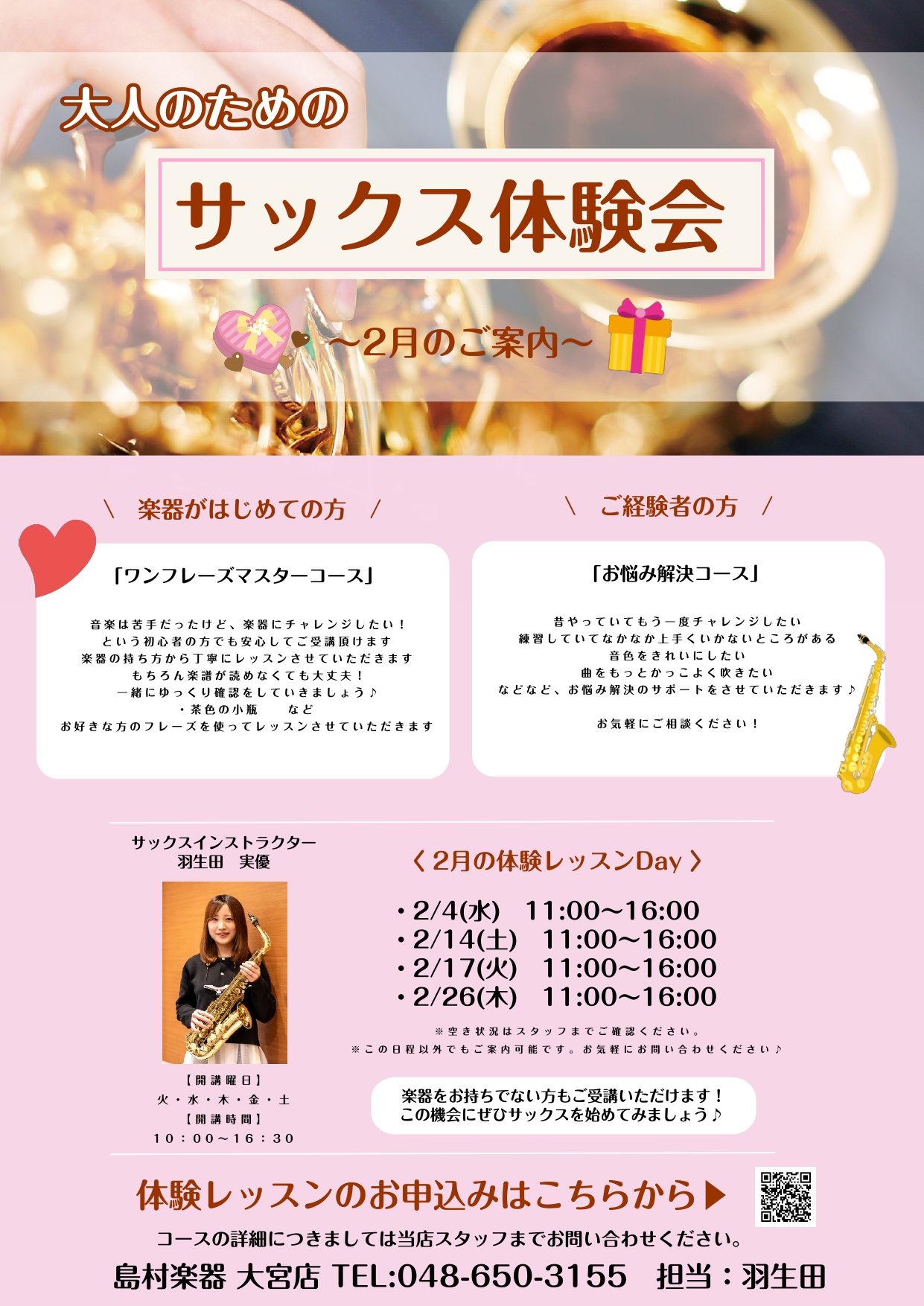 ![さいたま市大宮のみなさま、こんにちは!大宮店サックスインストラクターの羽生田です。寒い日が続いておりますね~⛄そんな日は温かい室内でサックスデビューしてみませんか♪ CONTENTSサックスを始めてみよう!まずは体験レッスン♪サックス体験レッスン空き状況(2/3~2/14)サックスインストラクター […]](https://www.shimamura.co.jp/shop/ohmiya/wp-content/uploads/sites/25/2025/12/20260122-ff34dc5f8dfe6e18269a50b9f028679f.jpg)