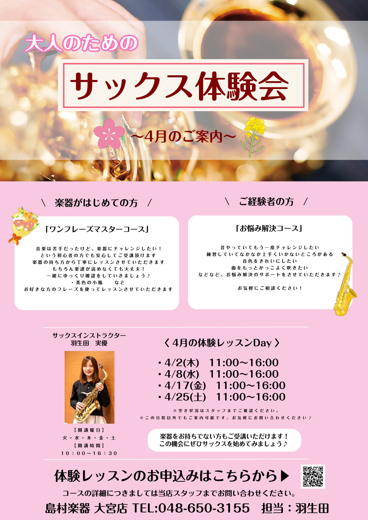 ![さいたま市大宮のみなさま、こんにちは!大宮店サックスインストラクターの羽生田です。少しずつ暖かい日が増えてきましたね🌷新生活に向けて、新しく楽器にチャレンジしてみませんか♪ CONTENTSサックスを始めてみよう!春の入会キャンペーン実施中🌸まずは体験レッスン♪サックス体験レッスン空き状況(3/31 […]](https://www.shimamura.co.jp/shop/ohmiya/wp-content/uploads/sites/25/2026/03/20260331-66cf03ef5ecf7420bb41a2a499db3f5b-1.jpg)