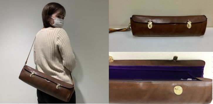 フルートのケースバッグは、大切なフルートを保護する重要なものです。ダークブラウンの他にライトブラウンとブラックの3色展開。ショルダーになっているので持ち運びやすく、普段の洋服に合わせやすいです!