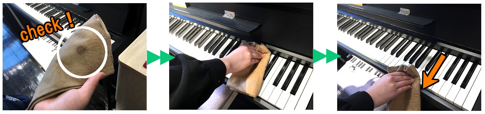 鏡面仕上げ or 半艶・艶消しそれぞれのピアノに合ったクリーナーを、クロスに少量つけて磨きます。多めにつけてしまうとベタベタしてしまう為、少しずつつけて汚れを取っていきましょう!乾拭きでは落ちない汚れもお手入れ用品を使用することで簡単にふき取ることができます♪