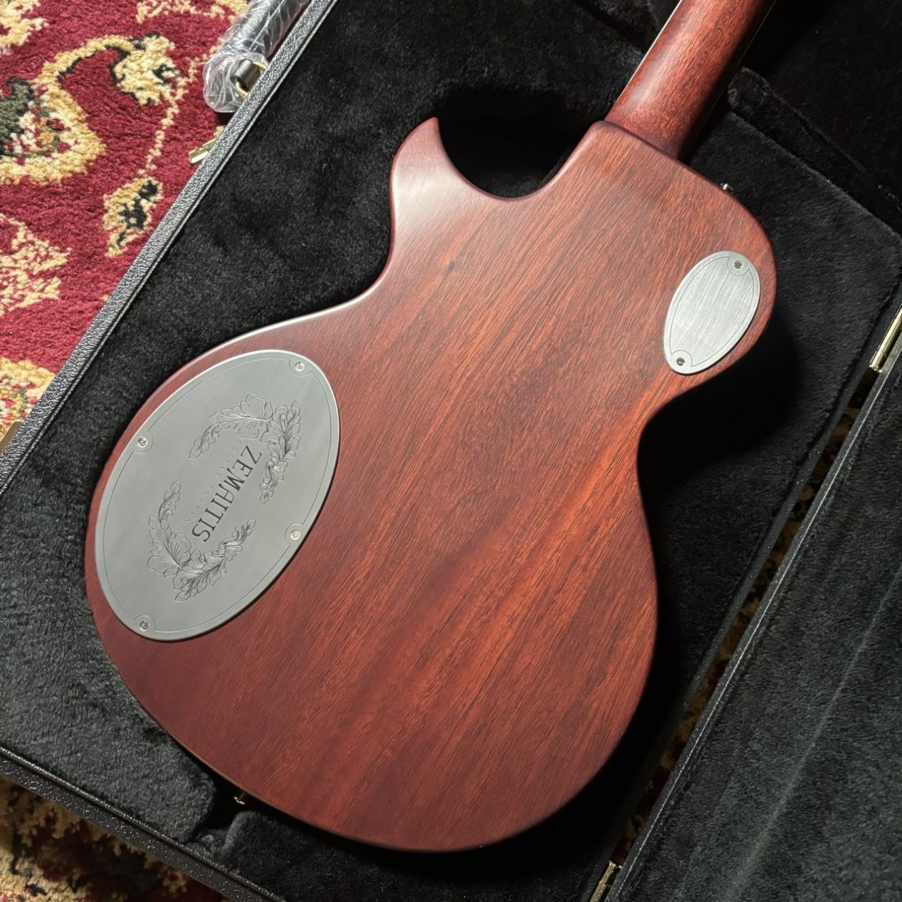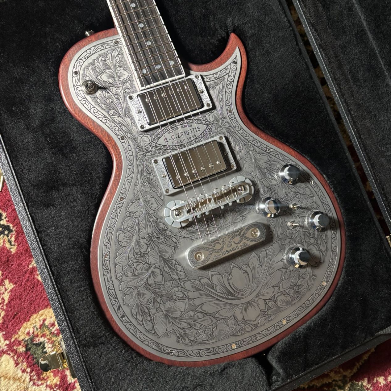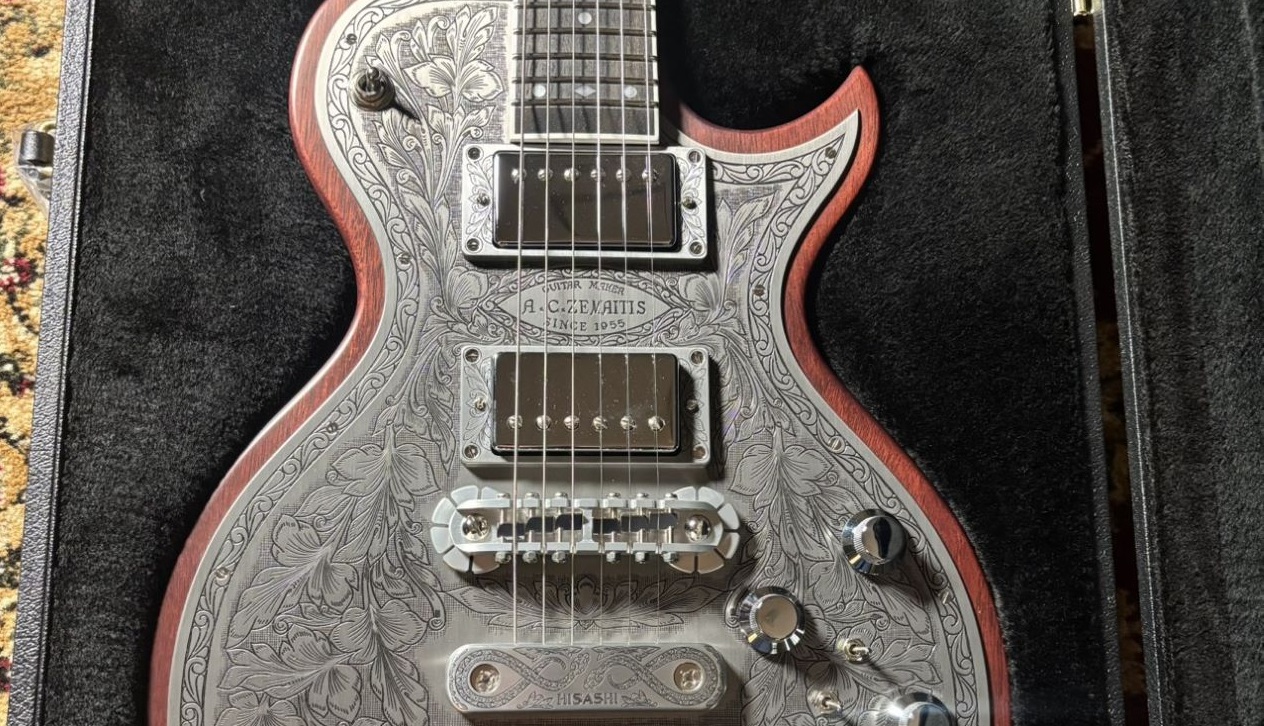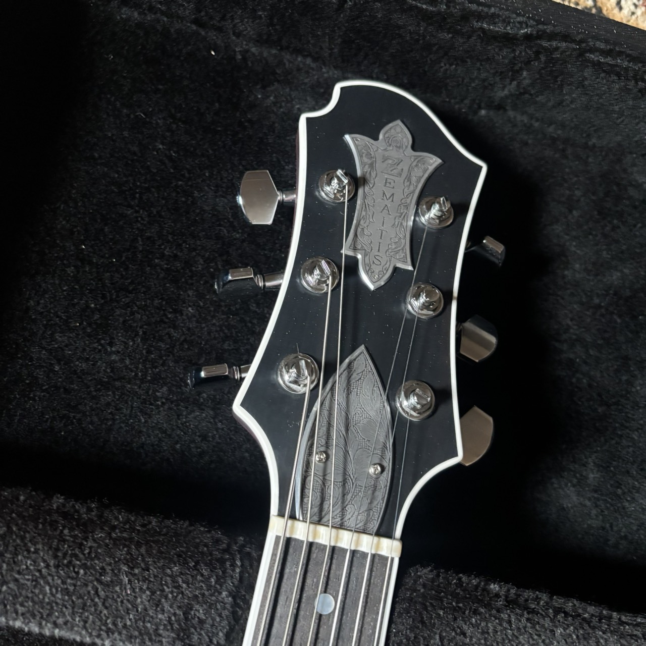 ナチュラルフィニッシュの杢目と、トップのメタルエングレイビングのコントラストは、“芸術作品としてのギター”というゼマイティスの原点を、改めて感じさせてくれるモデルです。
