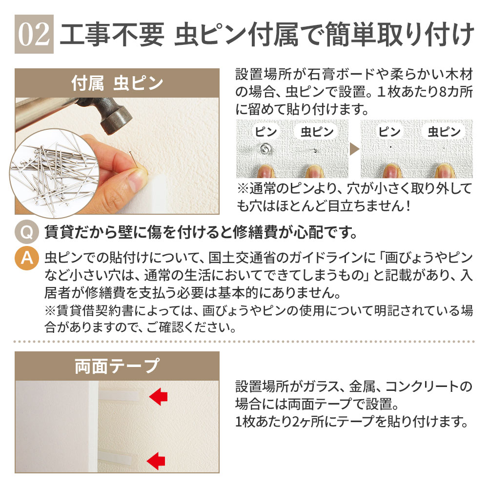 12枚セットで¥3,980(税込)✨これ、吸音材としては破格です!デザイン性を損なわないパネル型で、取り付けは画鋲よりも細い虫ピンで固定するので、壁の穴がほとんど目立ちません💡賃貸でも安心な商品となっております!
