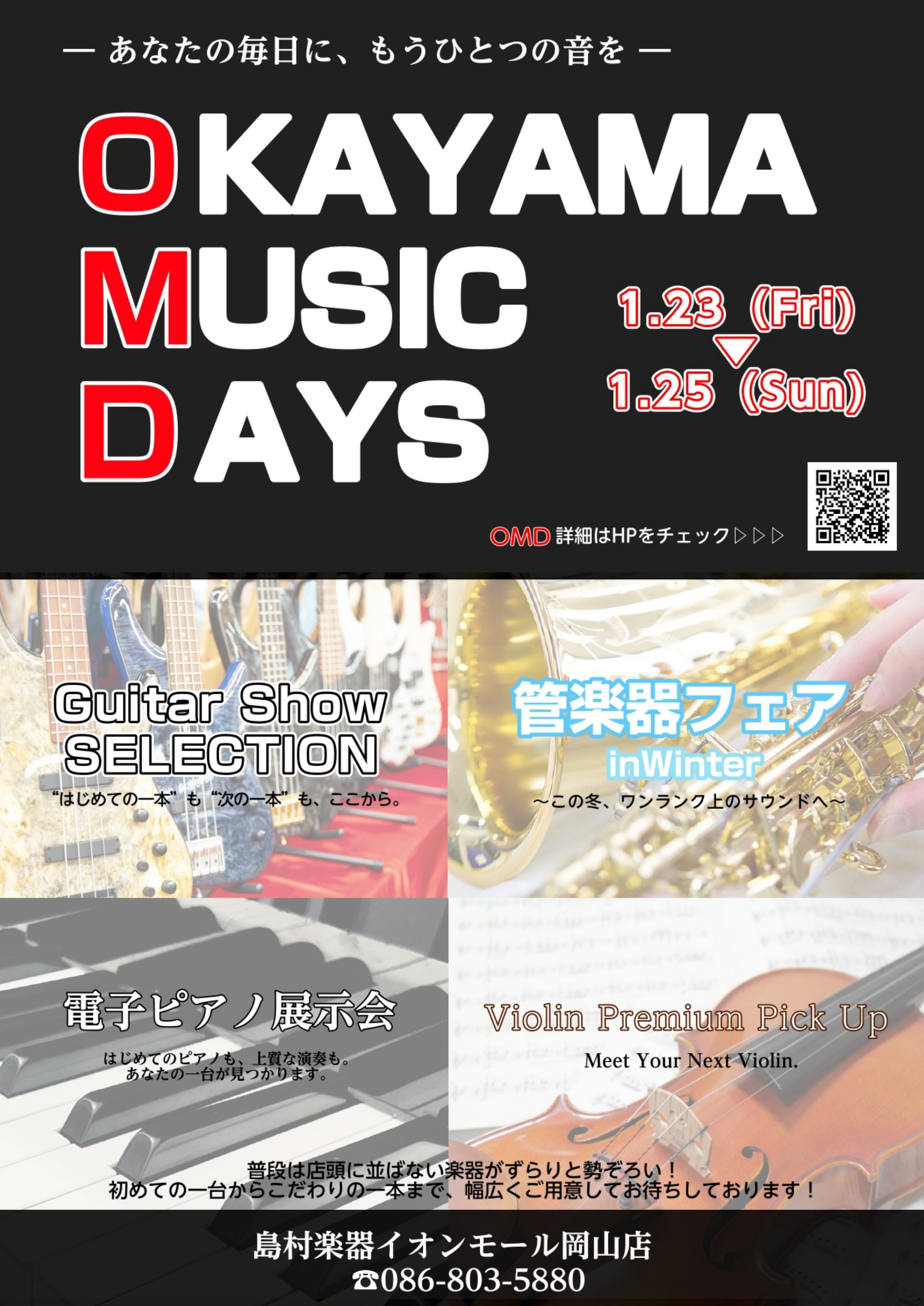 ![岡山で最も盛り上がる3日間!OKAYAMA MUSIC DAYS!選りすぐりの弦楽器を展示致します! 皆様こんにちは!HPをご覧いただきありがとうございます。イオンモール岡山店の大型催事です!ピアノ、ギター、管楽器、弦楽器が大集結!!弦楽器は、普段なかなか店頭に置いていないバイオリン、弓を展示!!こ […]](https://www.shimamura.co.jp/shop/okayama/wp-content/uploads/sites/63/2025/12/20251219-omd2026.png)