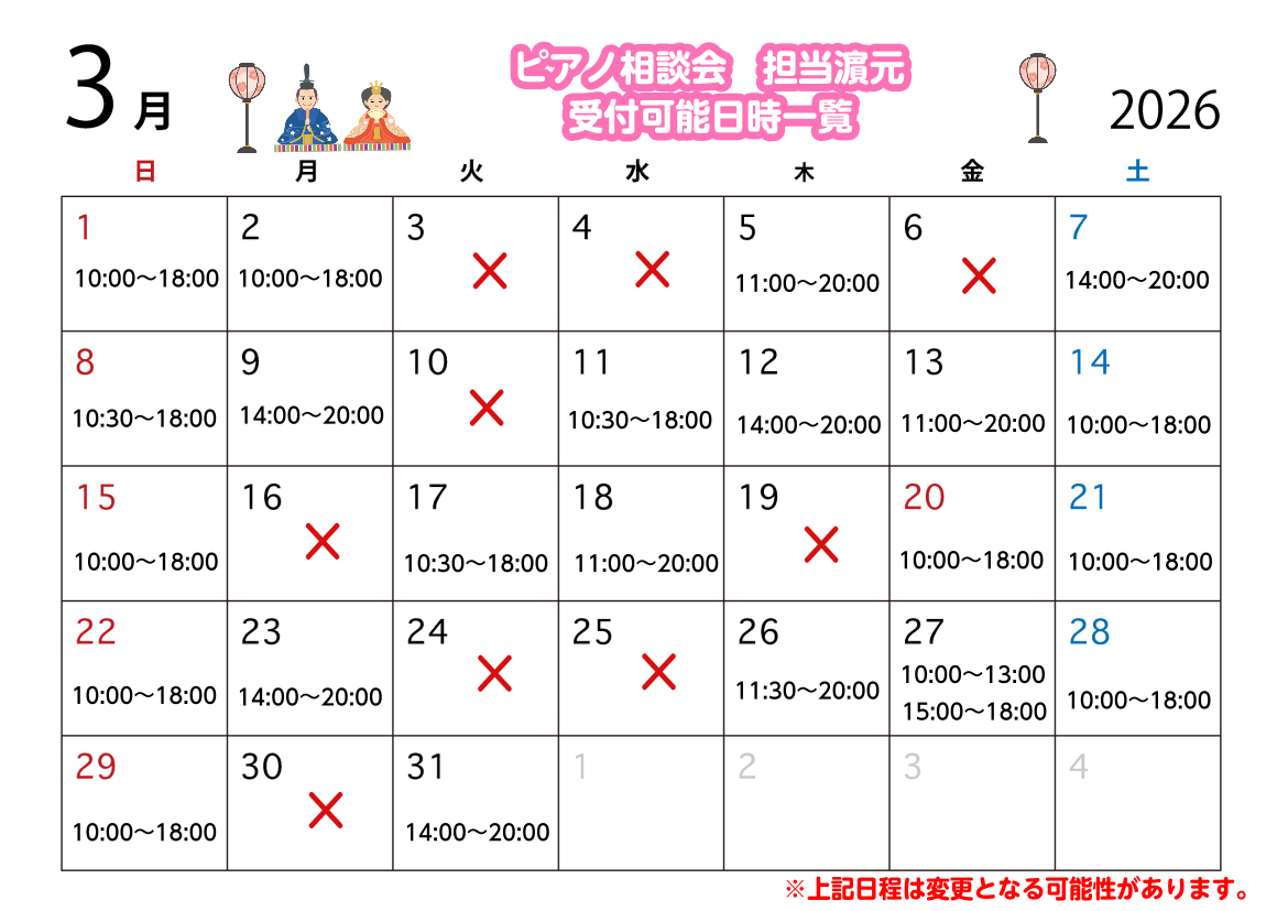 ピアノ相談会~ご予約可能日~※ご予約にご協力をお願いいたします。