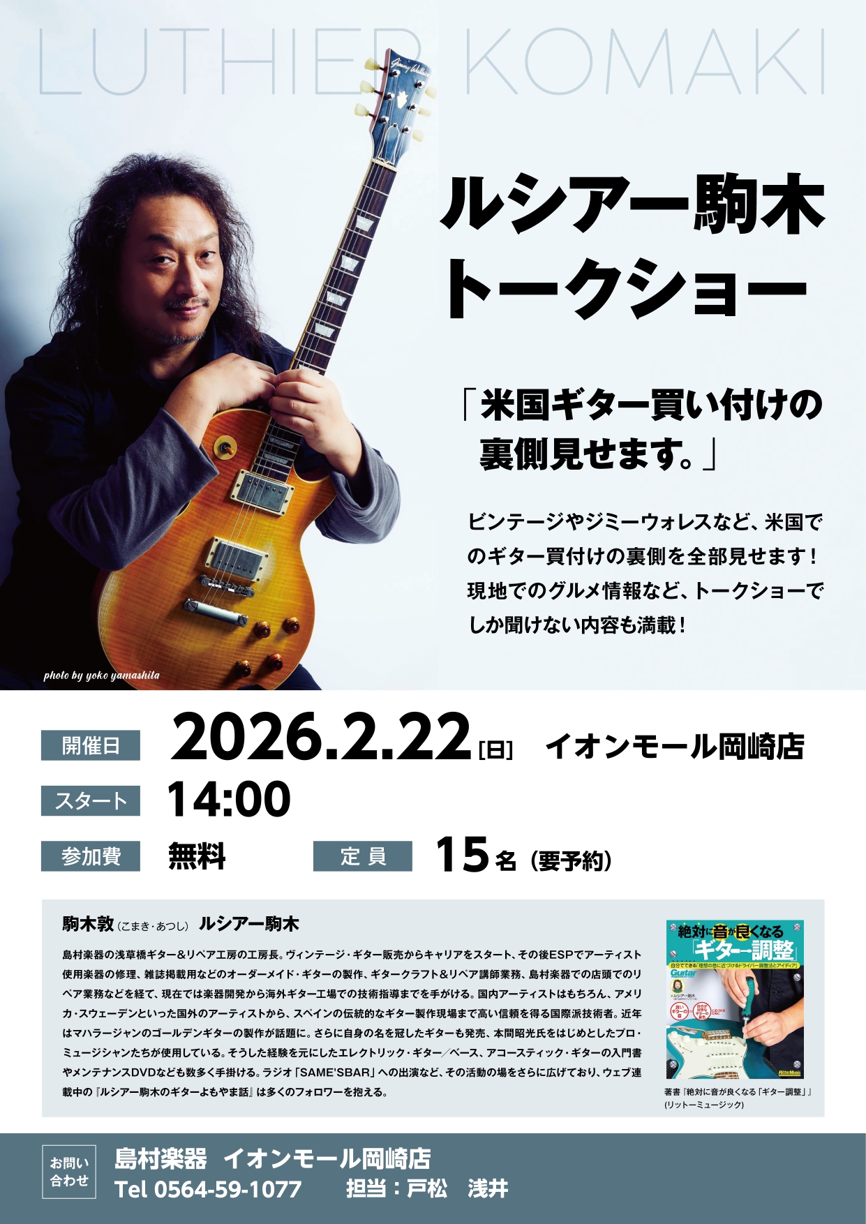![皆様こんにちは!岡崎店の戸松です。今回は岡崎店では恐らく初となる、刺激的なトークショー&試奏会を開催いたします! CONTENTSトークショー内容2025年米国買付の様子は下記をチェック!ルシアー駒木プロフィールご予約はお電話か下記フォームから!トークショー内容 アメリカで行われるギター買い付けの現 […]](https://www.shimamura.co.jp/shop/okazaki/wp-content/uploads/sites/52/2026/01/20260119-komaki-1.jpg)