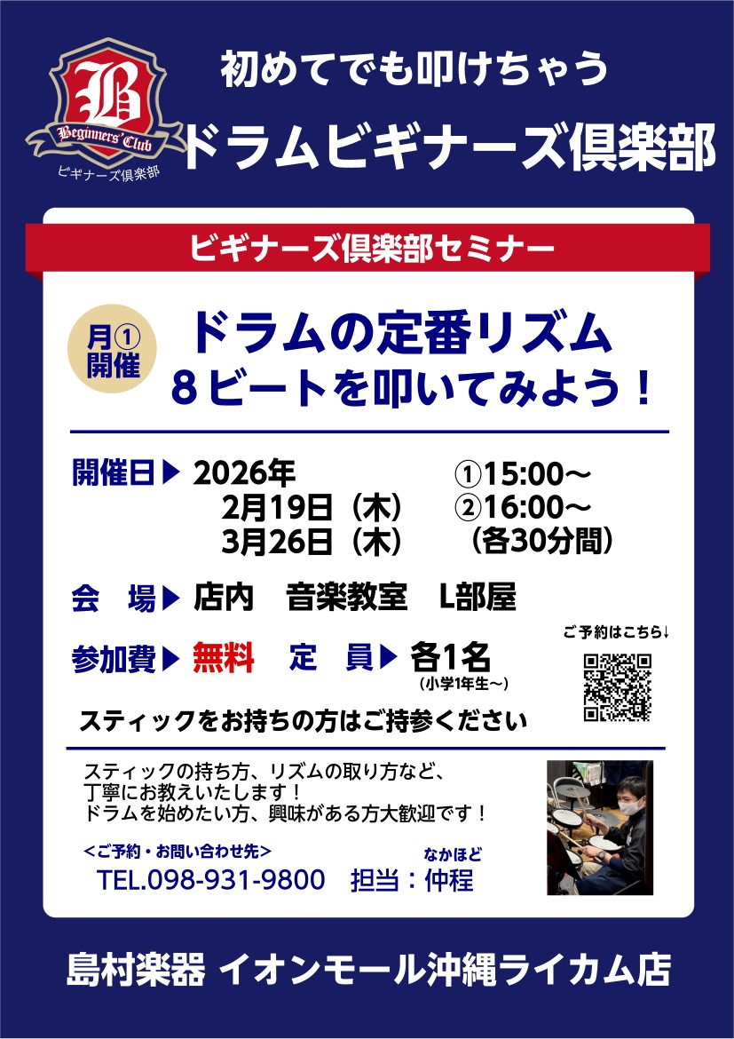 ![CONTENTS【はじめて】だからこそ参加してほしい実施内容受付状況はコチラです。もっとドラムを楽しみたい皆さまへスティックや電子ドラムの取り扱いもございます!お問合せ先【はじめて】だからこそ参加してほしい 島村楽器では、ドラムに興味がある方に向けて、「ビギナーズ倶楽部」と題した約30分のドラム&リ […]](https://www.shimamura.co.jp/shop/okinawa-rycom/wp-content/uploads/sites/196/2025/07/20250705-20211025-20190717-headimg.jpg)