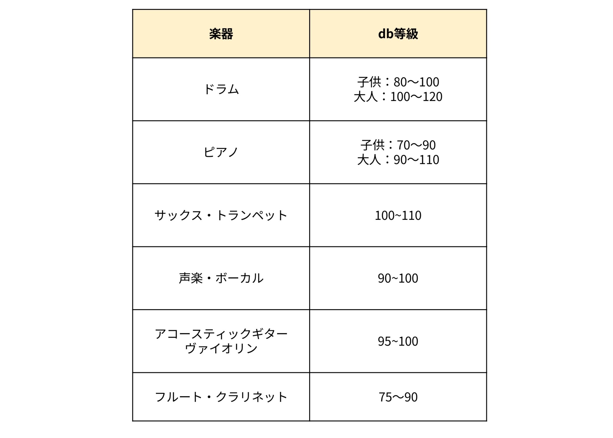 ほとんどの楽器が、一般的に「うるさい!」と感じてしまう65dbを大きく超えています・・・