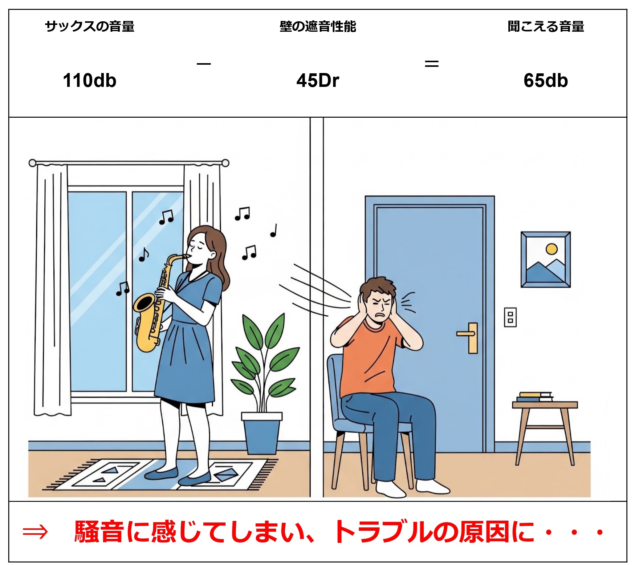例えば、マンションのお部屋で防音室なしで、サックスを演奏した場合は以下の通りです。