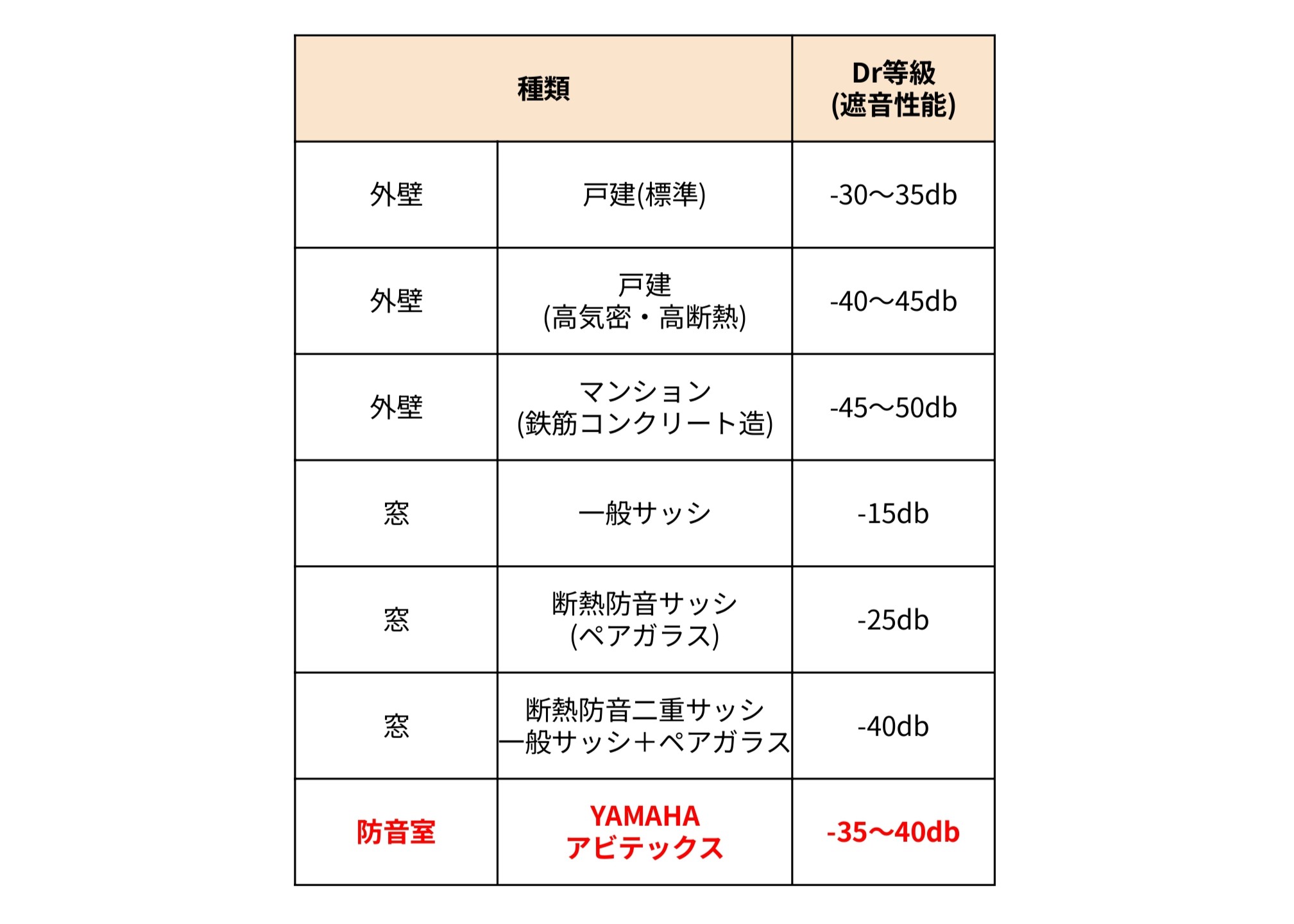 Dr等級は、遮音性能を表す日本工業規格(JIS)の単位。数字が大きくなればなるほど遮音性能が高くなります。