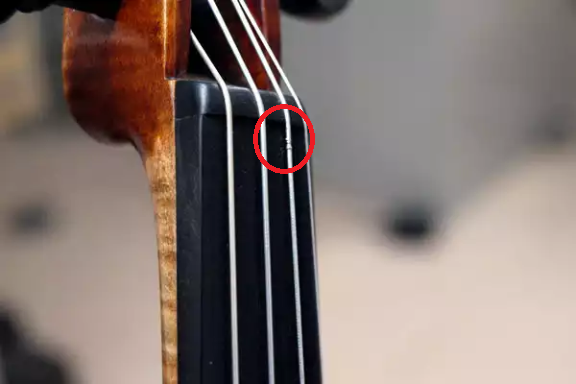 赤丸上部の上ナットの溝がキレイに掘れていなく、弦がひっかかり、ほつれている可能性があります。