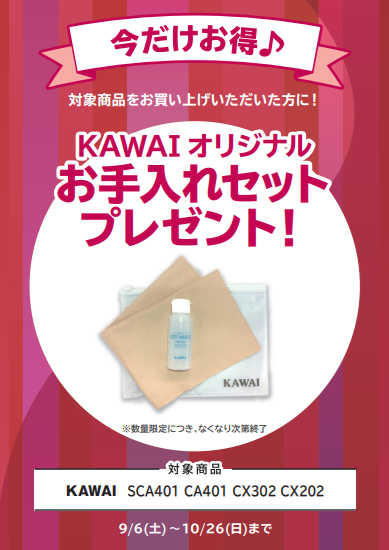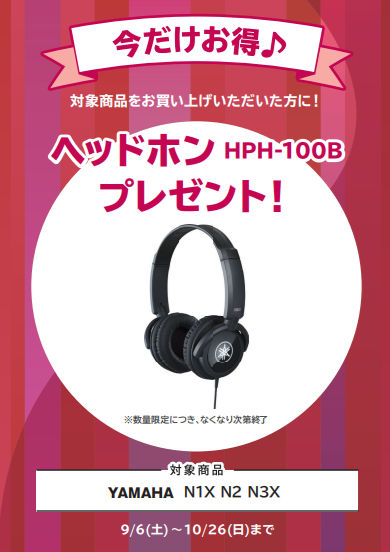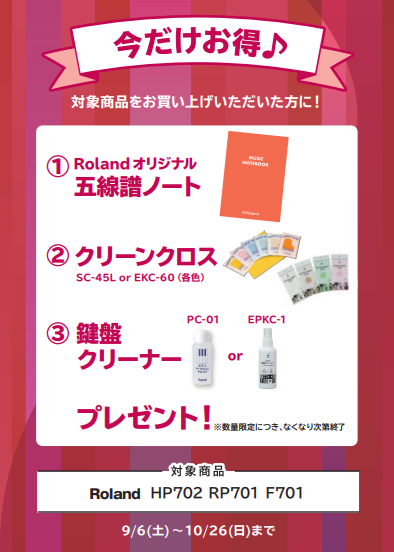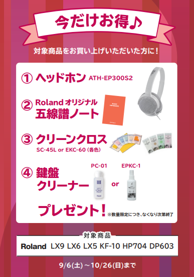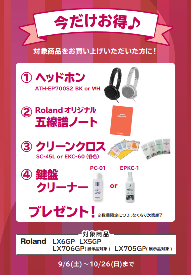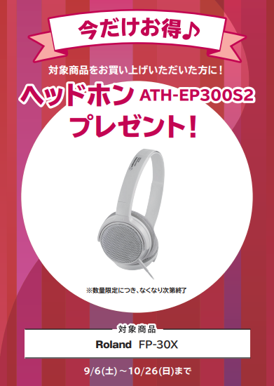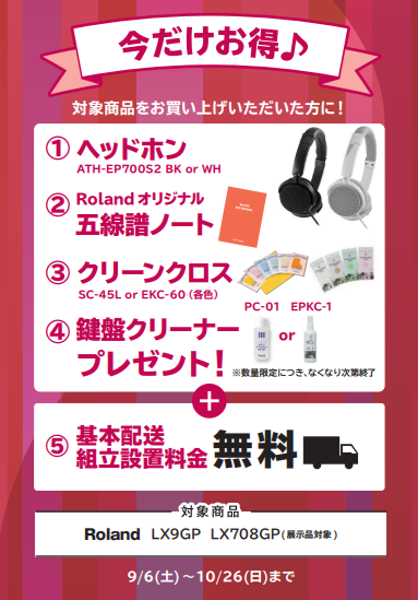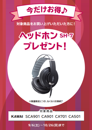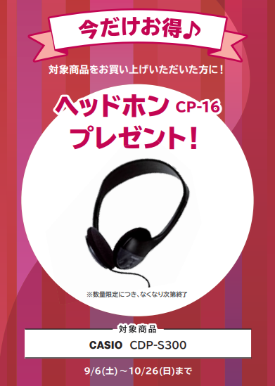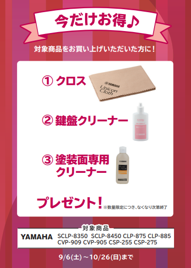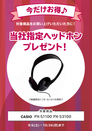 当店では9月6日(土)~10月26日(日)まで電子ピアノフェアを開催中です!対象商品のご購入で、お得なご成約特典をプレゼントいたします。