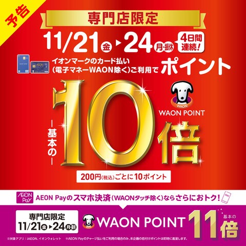 【お買い得情報】11/21(金)~24(月祝)の4日間限定!イオンカードお支払いでポイント10倍✨