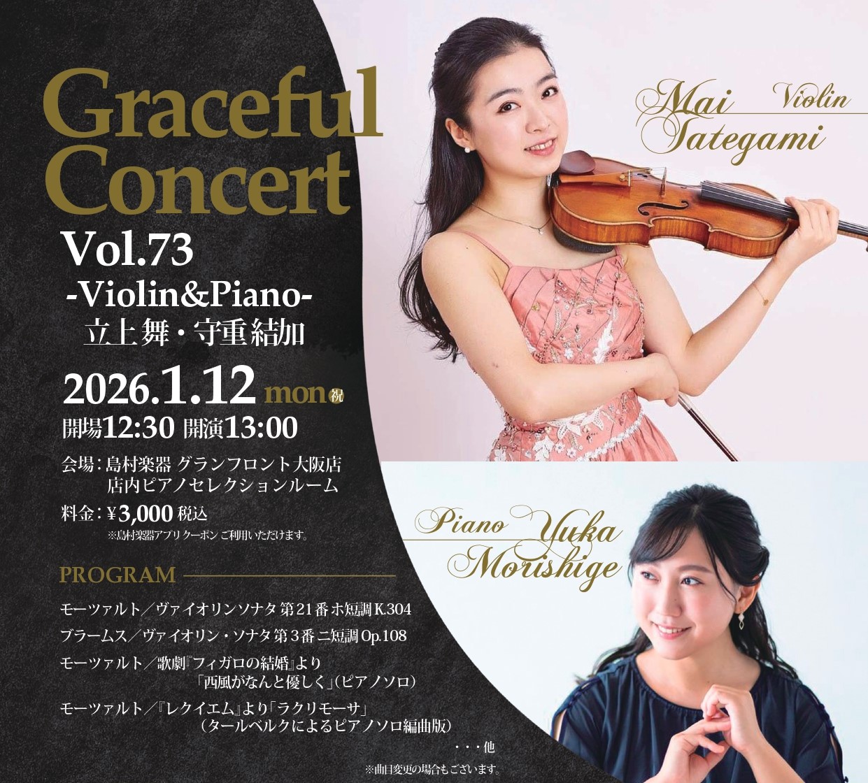 ヴァイオリニストの立上舞さんと、ピアニストの守重結加さんをお迎えし、コンサートを開催いたします。