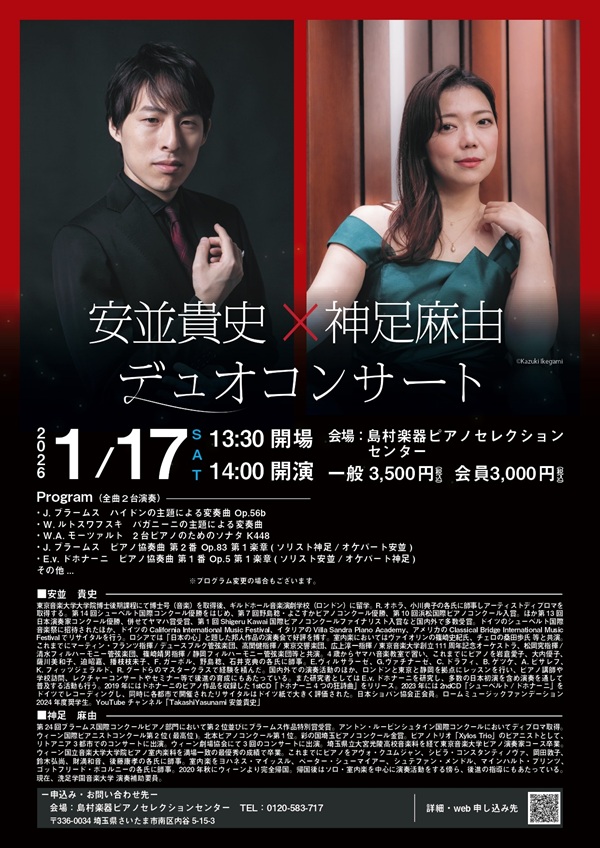 演奏は、国内外のコンクールで数々の受賞歴を誇り、世界を舞台に活躍を続ける安並貴史さんと神足麻由さん。卓越したテクニックと深い楽曲解釈、そして豊かな音楽性で、多くの聴衆を魅了してきたお2人です。
