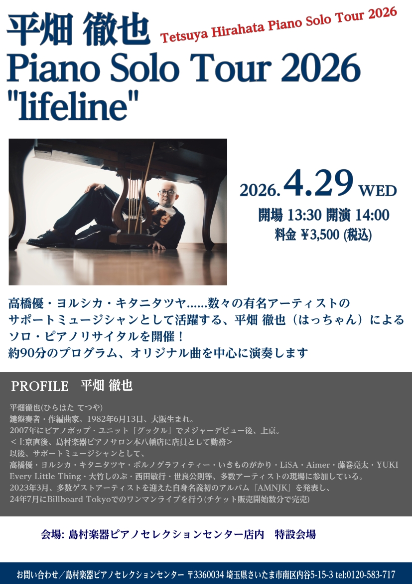 数々のアーティストを支えてきた平畑徹也さんによる素敵な演奏をお届け! 高橋優・ヨルシカ・キタニタツヤ……数々の有名アーティストのサポートミュージシャンとして活躍する、平畑 徹也(はっちゃん)によるソロ・ピアノリサイタルツアーが開催されます。埼玉会場は当店、島村楽器ピアノセレクションセンターで開催いた […]