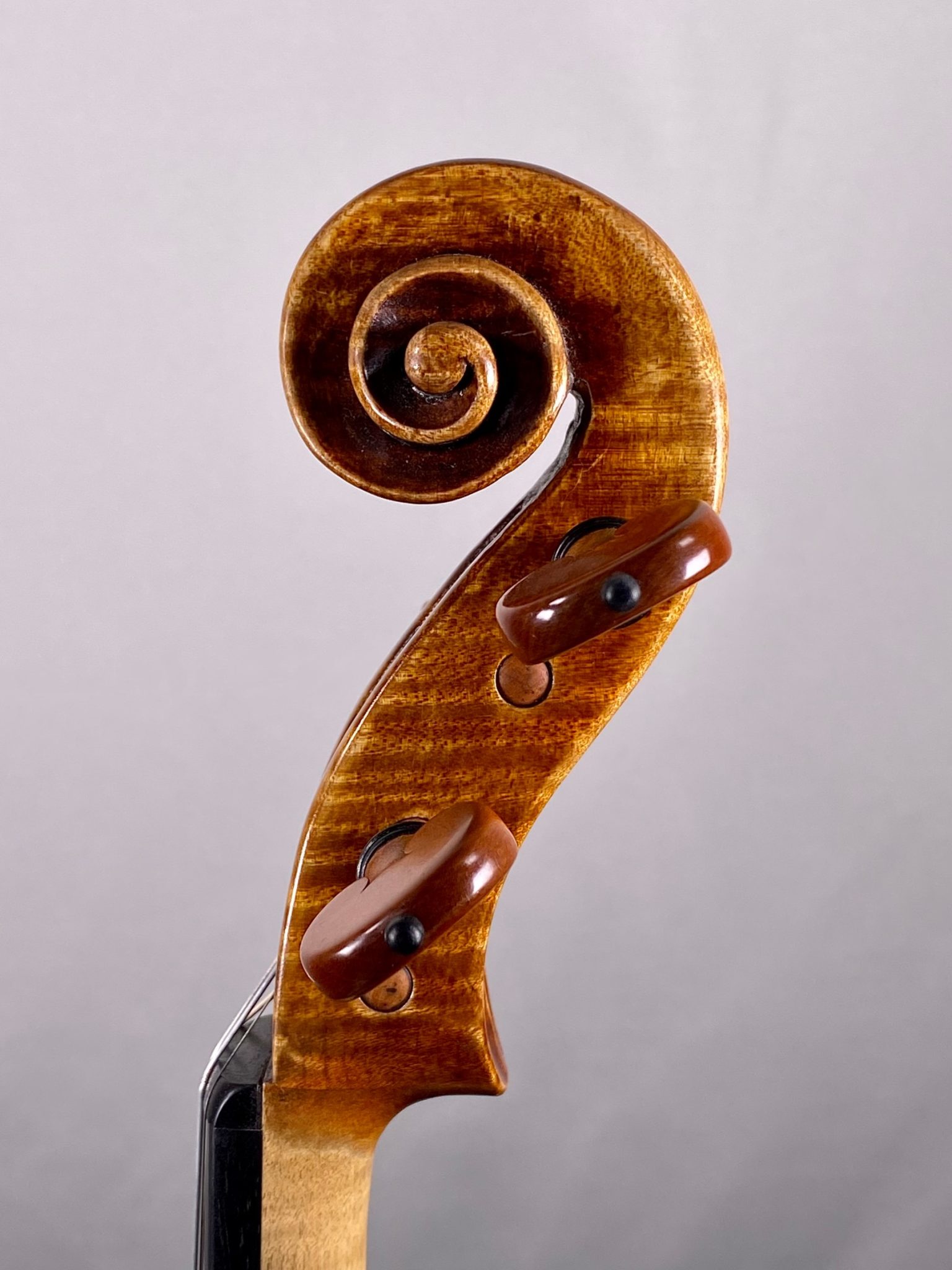 本作は、歴史的名匠:Giovanni Battista Guadagnini(ジョバンニ・バティスタ・ガダニーニ)がパルマでの製作時代である1763年の名器「Ex Lamiraux」を正確にコピーした復刻モデルです。製作証明書には「direct study」と記されていることから、彼らはオリジナル(本物)の「Ex Lamiraux」を手元に置きながら、じっくり時間をかけ入念に且つ正確に仕上げたとの事。その言葉通り、寸法だけでなく枯れたサウンドまでもガダニーニを細部までよく捉えた力作となっています。深みとパンチを兼ね備えた、非常に印象的な作品に仕上がっております。