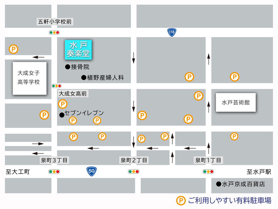 | 水戸駅北口4番乗り場 「茨城交通・水戸市内循環バス内回りルート」 | 「大成女子高前」停留所下車(所要約7分)→ 徒歩3分 |