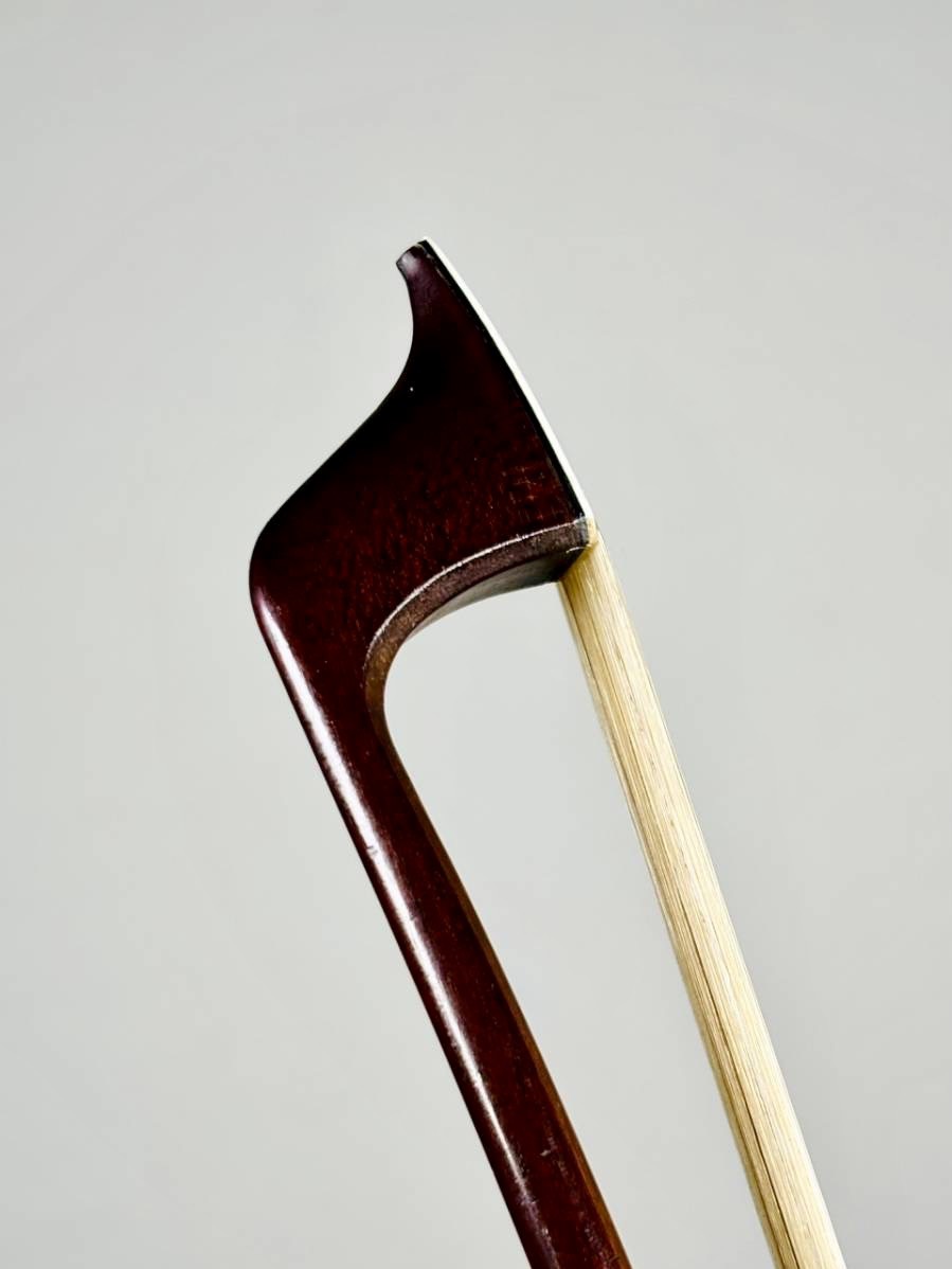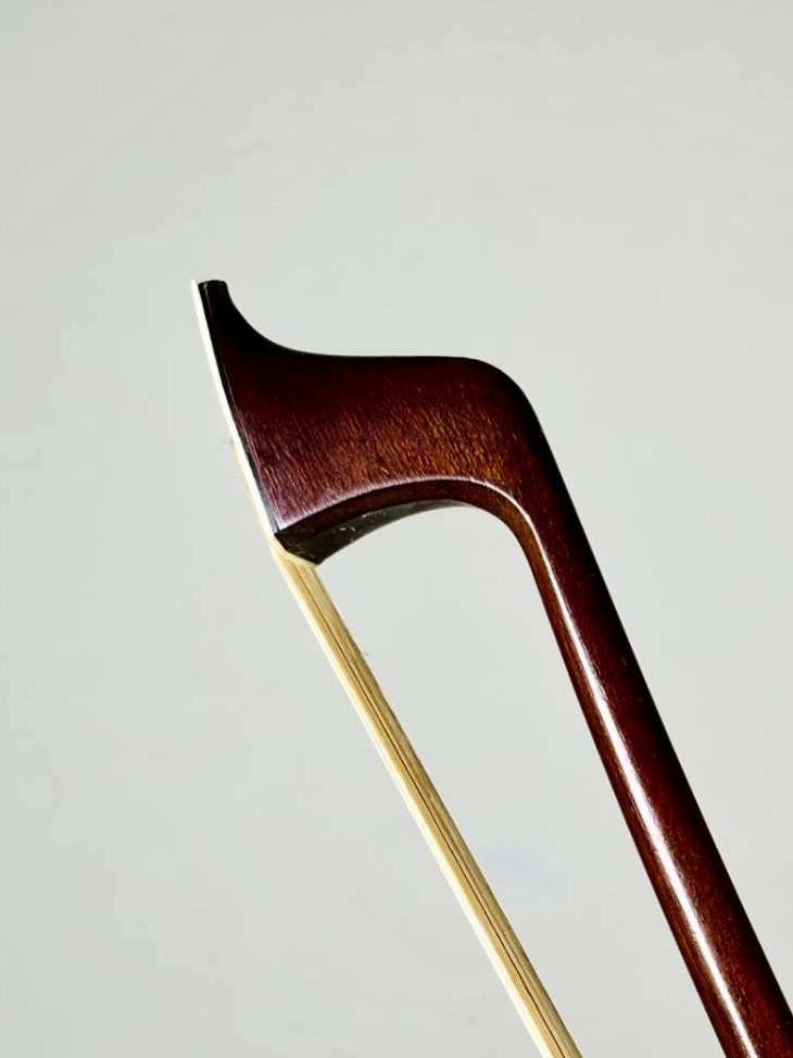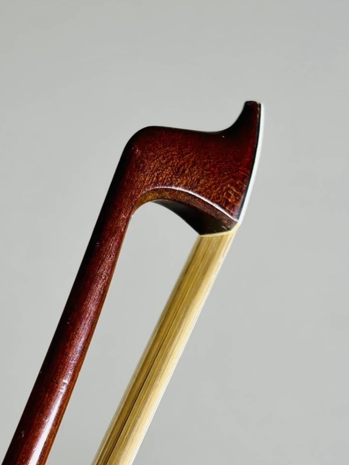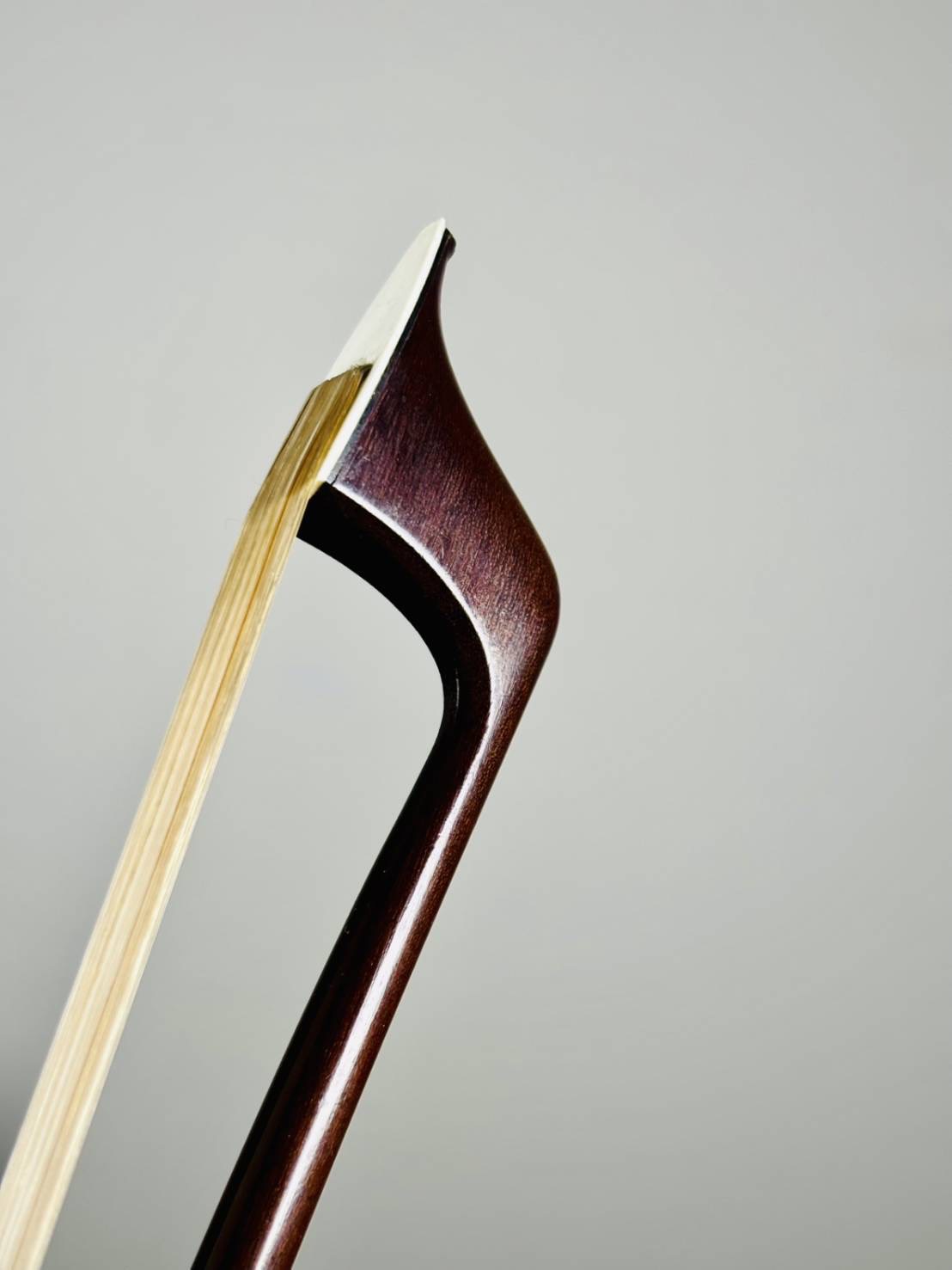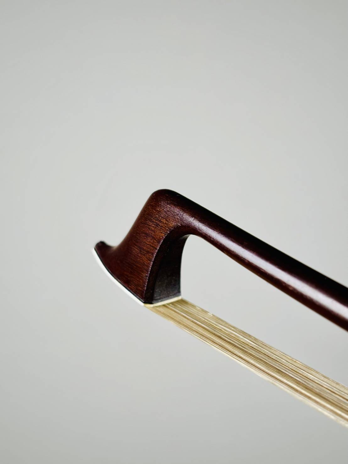 サルトリーの代名詞とも言える力強く美しい流線型のヘッドには、現代では入手困難となった高密度の最高級フェルナンブーコ材が用いられています。オールド弓としては類を見ないほど保存状態が良く、今なお驚異的な復元力と強度を保っております。その音色は楽器本来の響きを最大限に引き出し、雑味のないクリアで芯のある響きを奏者にもたらします。圧倒的なレスポンスの良さは、手元から弓先に至るまで自由自在な表現を可能にするでしょう。