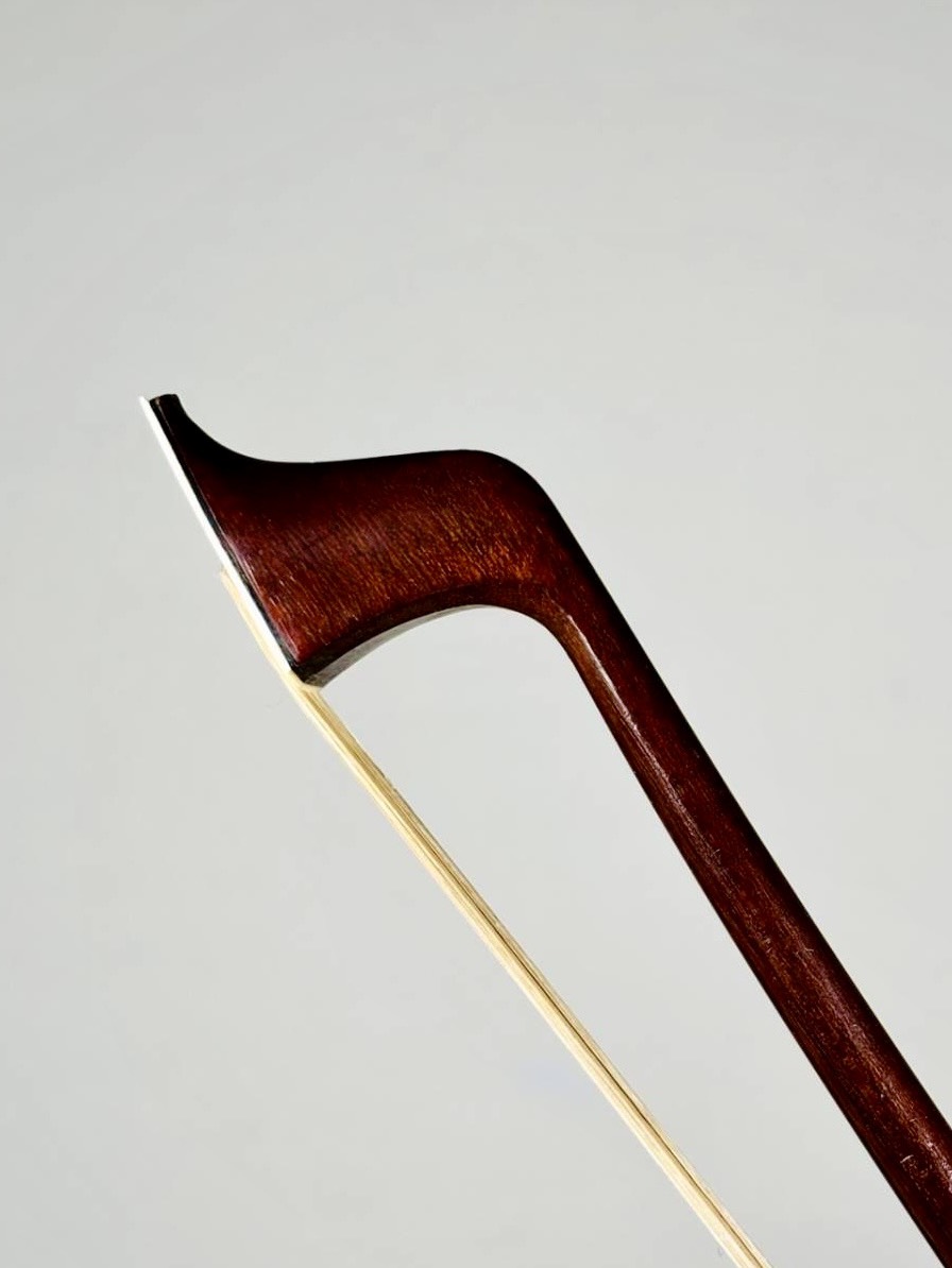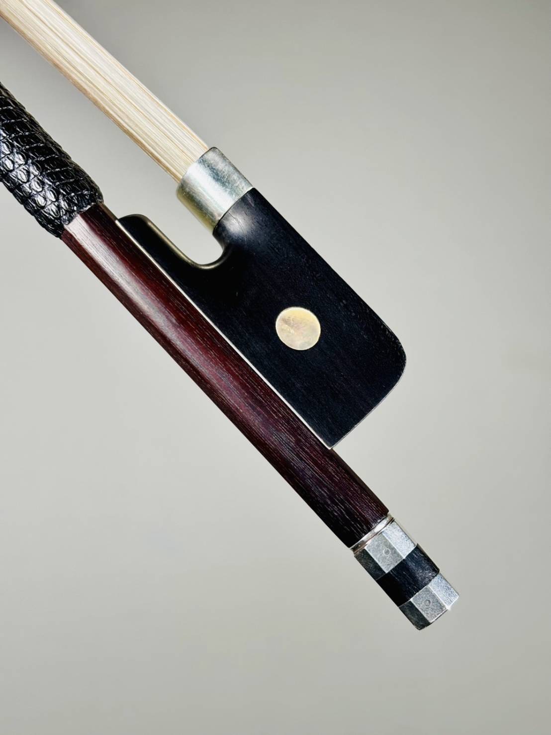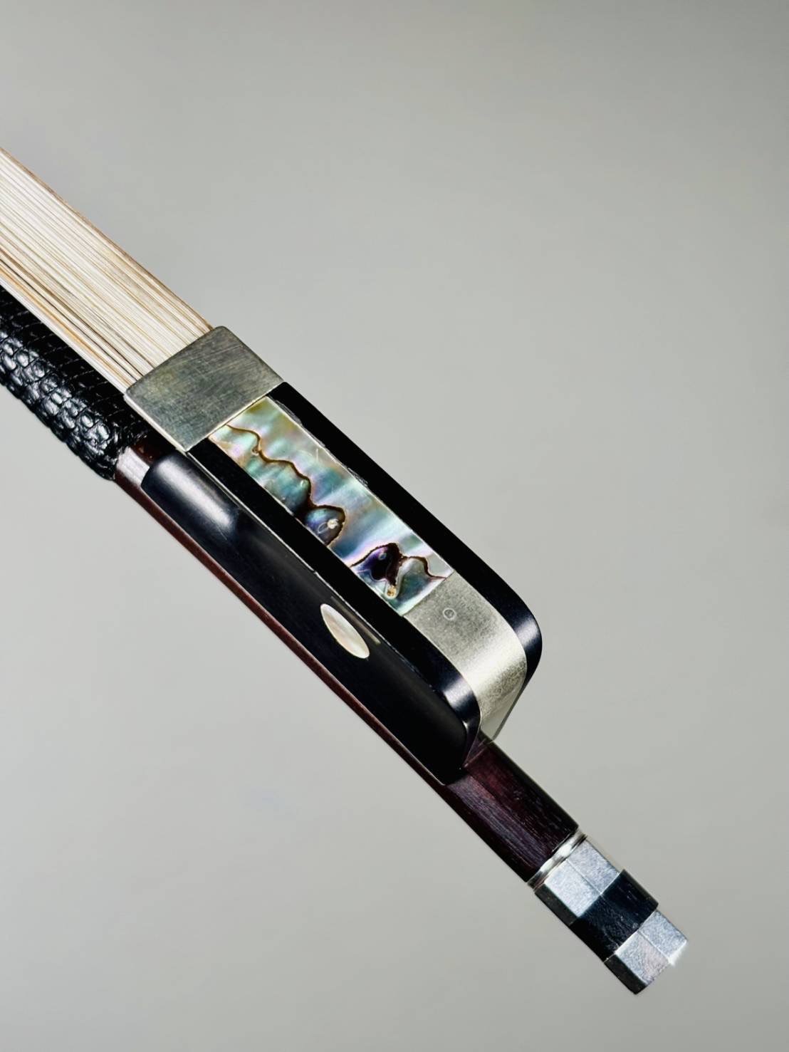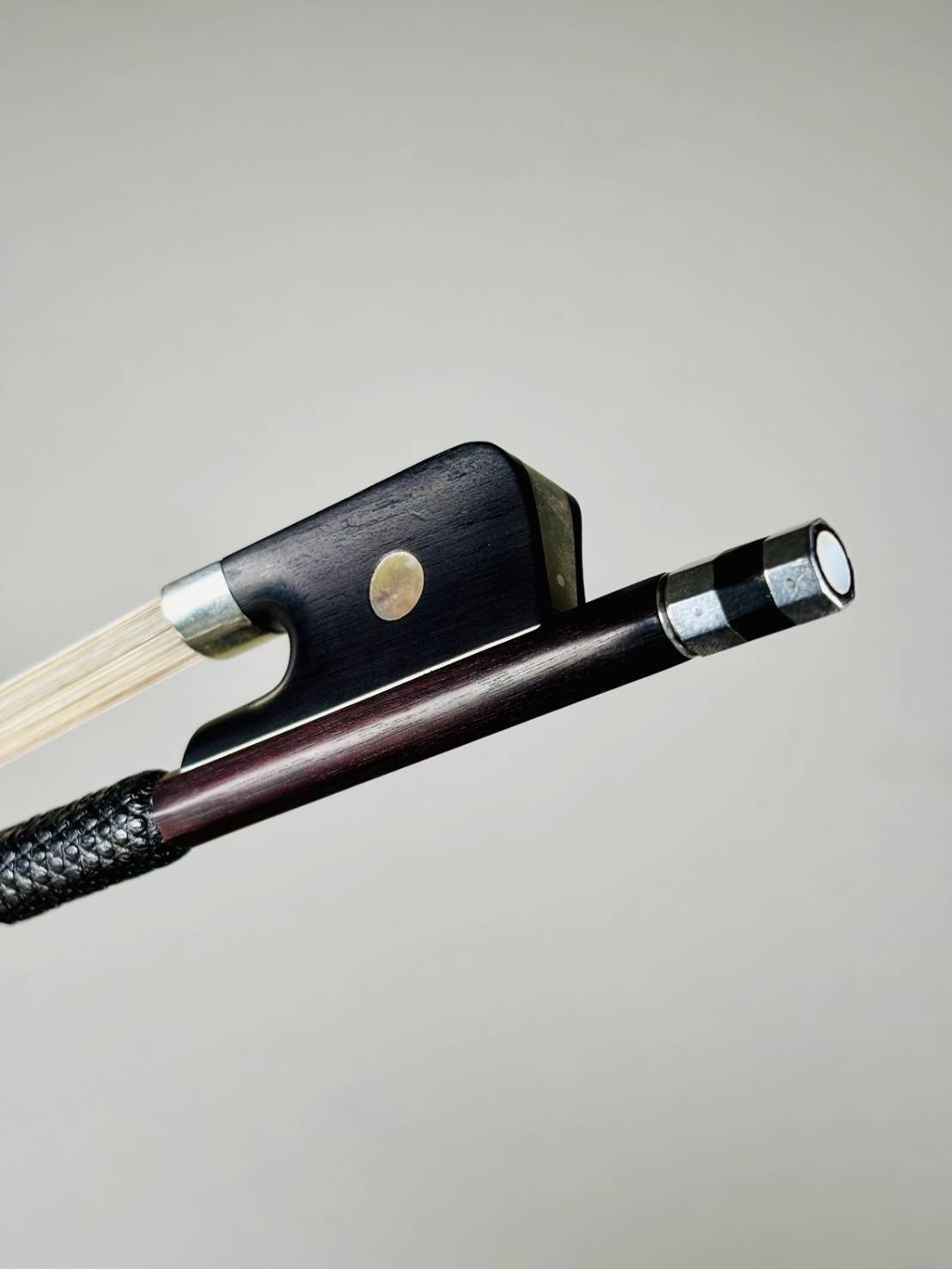 サルトリーの代名詞とも言える力強く美しい流線型のヘッドには、現代では入手困難となった高密度の最高級フェルナンブーコ材が用いられています。オールド弓としては類を見ないほど保存状態が良く、今なお驚異的な復元力と強度を保っております。その音色は楽器本来の響きを最大限に引き出し、雑味のないクリアで芯のある響きを奏者にもたらします。圧倒的なレスポンスの良さは、手元から弓先に至るまで自由自在な表現を可能にするでしょう。