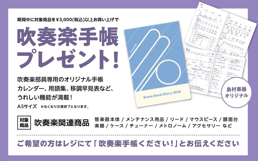 期間中、対象商品を¥3,000(税込)以上お買い上げのお客様に「吹奏楽手帳」を1冊プレゼント!
