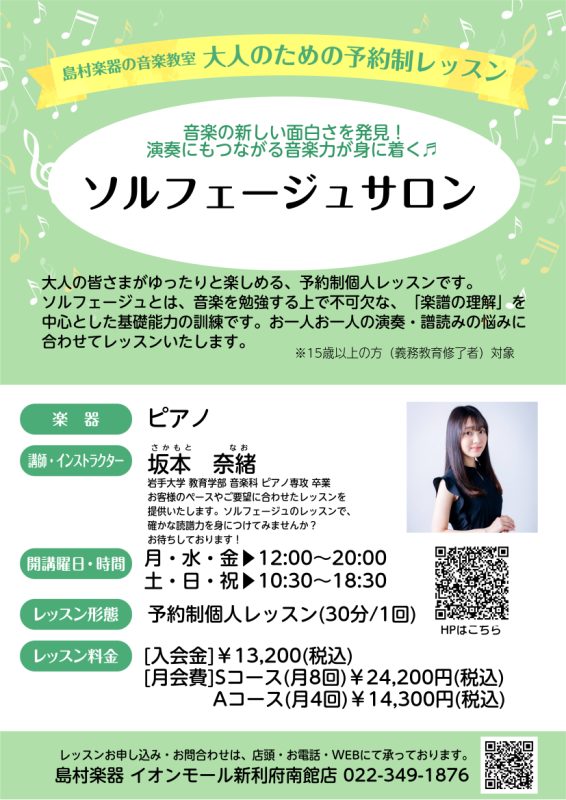 ![皆様こんにちは!インストラクターの坂本です。音楽の楽しさを更に実感できるソルフェージュのレッスンについてご紹介いたします♪ CONTENTSソルフェージュとは…?ソルフェージュレッスン内容1か月お試しレッスンの内容例コース・料金に関してインストラクターお問い合わせソルフェージュとは…? ○○できるよ […]](https://www.shimamura.co.jp/shop/rifu/wp-content/uploads/sites/17/2022/07/20260114-image1-2.jpeg)