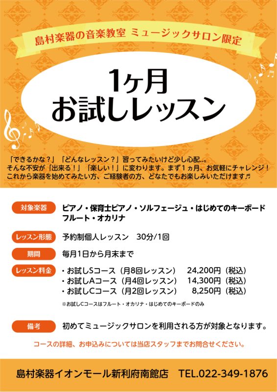 1ヶ月間のレッスンでレッスン時の雰囲気、楽器を演奏する楽しさをたっぷり味わってみませんか?