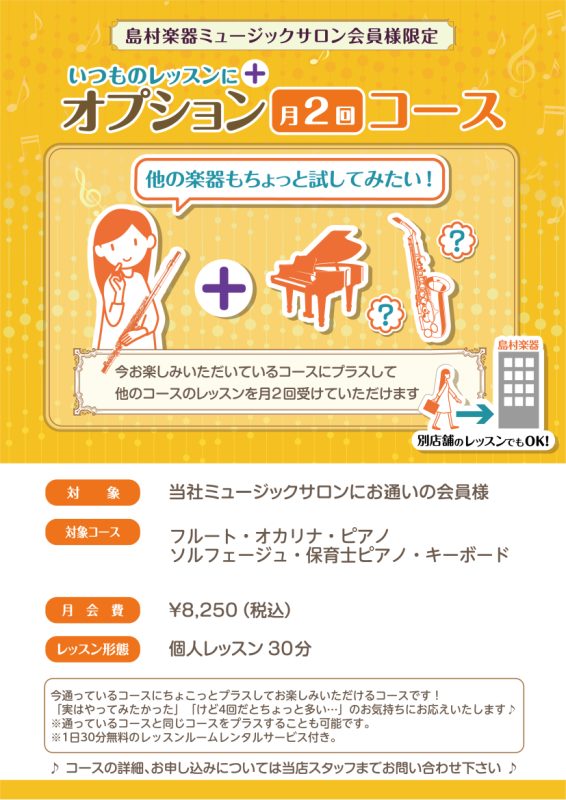 例:①ピアノA(月4回¥14,300円)×ソルフェージュオプ2(月2回¥8,250円)→合計月6回、ピアノメインでソルフェージュも学びたい!