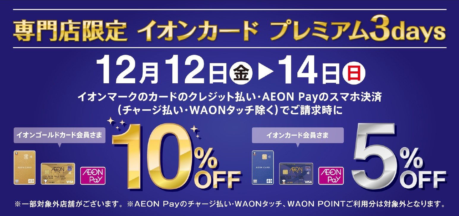 - 12月12日(金)~12月14日(日)イオンカード5%・ゴールドカード10%OFF!