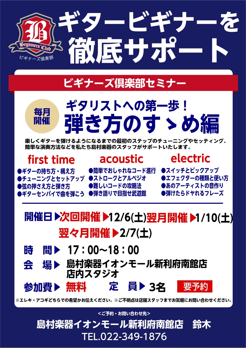 ![CONTENTSビギナーズ倶楽部とは?こんな方にもオススメイオンモール新利府南館店ギター&ベースビギナーズ倶楽部の開催日程持ち物イオンモール新利府南館店のギターセンパイ(鈴木)持ち物イオンモール新利府南館店のベースセンパイ(明石)ご予約方法ビギナーズ倶楽部とは? これからギターを始めたいけど何にもわ […]](https://www.shimamura.co.jp/shop/rifu/wp-content/uploads/sites/17/2022/04/20220418-20220413-413eb2b60f442dc4cd0d70a6e4ebb50a.jpg)