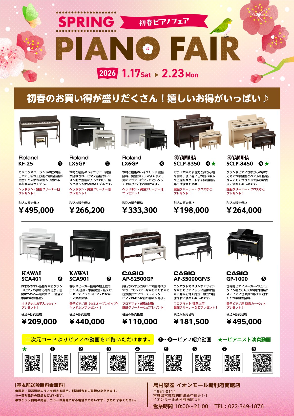 ![新品から、お求めやすい中古電子ピアノ、豪華ご成約特典など、豊富に取り揃えてお待ちしております。 電子ピアノを選ぶなら島村楽器イオンモール新利府南館店へ! 当店は仙台市を中心に、塩釜、多賀城、気仙沼など仙塩地区、石巻地域、盛岡方面や相馬など広いエリアのお客様にお越しいただいております。 ホームページで […]](https://www.shimamura.co.jp/shop/rifu/wp-content/uploads/sites/17/2026/01/20260116-75cad4d9364468fb98ec6cc81750f289.jpg)