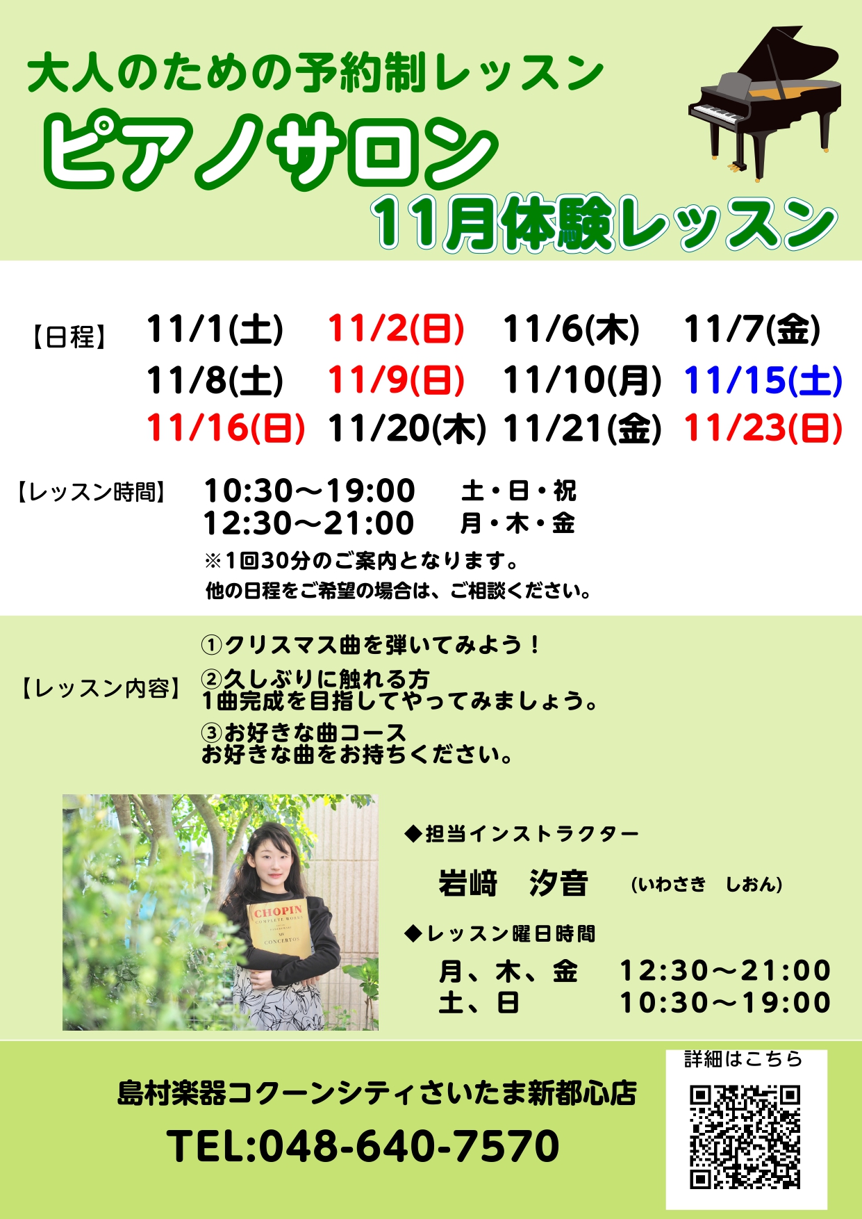 ![ピアノサロンでは、大人の方向けにレッスンをしております。 「あの曲弾きたかったのだけど、途中でやめてしまった、」 「この曲いつかは弾けるようになってみたいな」 そんな方いらっしゃいませんか?? 初めての方でもご参加できるような内容になっておりますので、是非お気軽にご参加ください。 CONTENTSレ […]](https://www.shimamura.co.jp/shop/saitama-shintoshin/wp-content/uploads/sites/184/2025/11/20251107-product_shima251031-0300-1_template_pdf_page-0001.jpg)