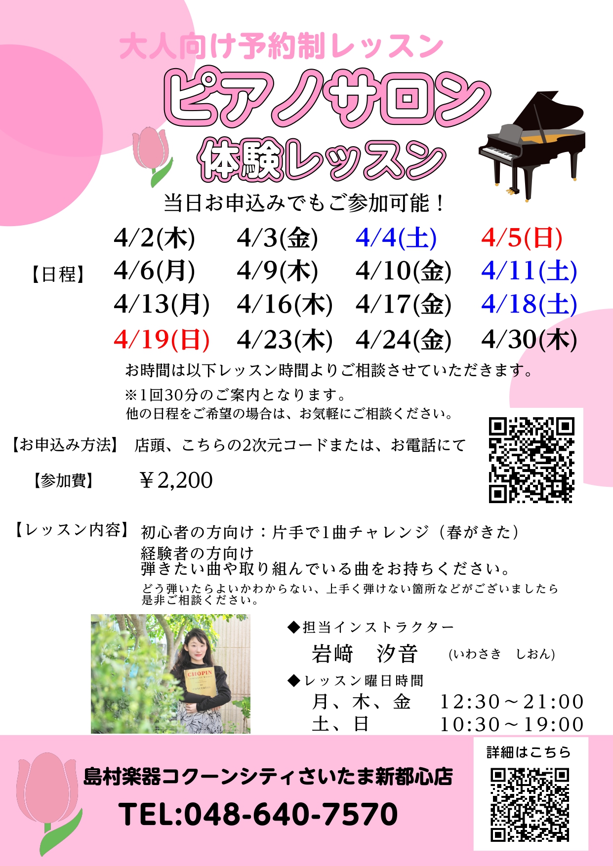 ![ピアノサロンでは4月にピアノ体験レッスンを行っております! 「ピアノを子どもの頃に習っていたけれども、また弾いてみたい!」 「ずっとピアノが弾いてみたかったけれども、始めるタイミングに出会えてなかった。」そんな方いらっしゃいませんか? 是非この機会に体験レッスンを受けてみませんか? CONTENTS […]](https://www.shimamura.co.jp/shop/saitama-shintoshin/wp-content/uploads/sites/184/2026/04/20260405-product_shima260402-0031-1_template_pdf_page-0001-1.jpg)