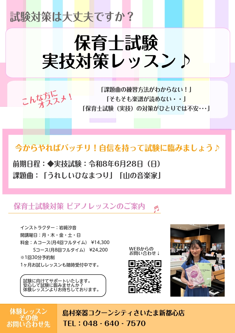 ![こんにちは! 島村楽器の音楽教室では、保育士実技試験を受けられる方のサポートを行っております。 実技試験対策の方はいかがでしょうか? 試験までサポートさせていただきますので、お気軽にご相談ください! CONTENTSこんな方におすすめ!コース概要1ヶ月お試しレッスンも行っております!インストラクター […]](https://www.shimamura.co.jp/shop/saitama-shintoshin/wp-content/uploads/sites/184/2026/04/20260417-product_shima260416-0202-1_template_pdf_page-0001-1.jpg)