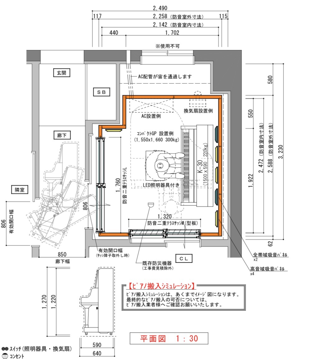 グランドピアノに買い替えた場合でも使用可能なタイプの防音室で設計いたしました。