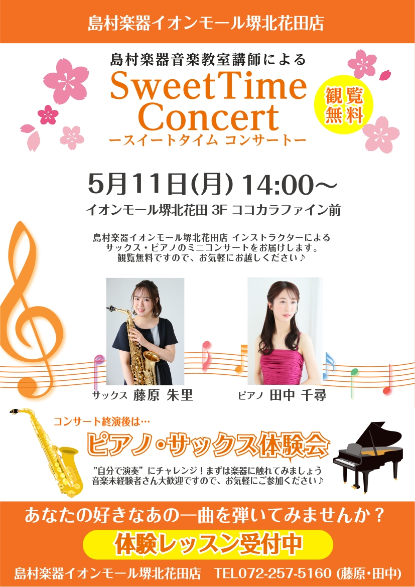 5月11日(月) Sweet Time Concert&ピアノ・サックス体験会 開催いたします!