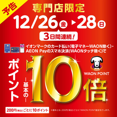 2025年12月26日(金)~28日(日)の3日間は、イオンマークのついたイオンマークのカード払い・AEON Payのスマホ決済ででポイントが基本の10倍!