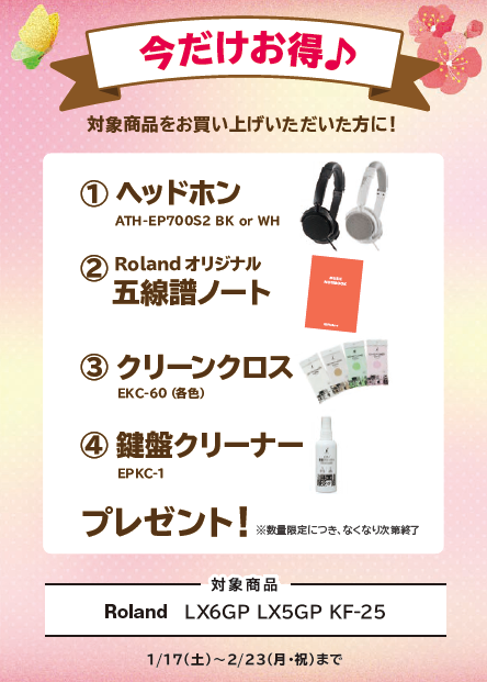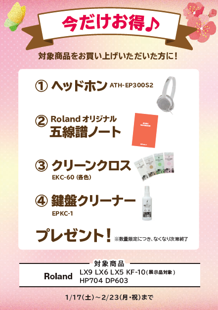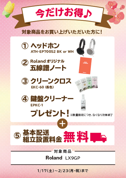 Roland/LX9・LX6・LX5・LX706・KF-10(展示品対象)・DP603ヘッドホン、Rolandオリジナル五線譜ノート、クリーンクロス、ウォッシュ