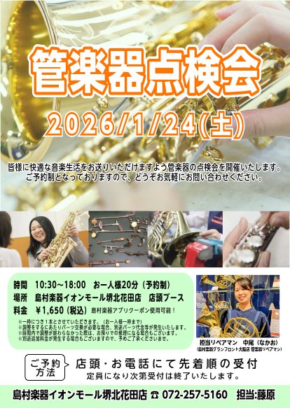 ![CONTENTS管楽器の定期点検はしていますか?開催日程お問い合わせは、このスタッフへ♪管楽器の定期点検はしていますか? 管楽器プレイヤーの皆様、お使いの楽器は状態はいかがでしょうか?管楽器は定期的な点検・調整をしてあげることで、楽器の寿命を伸ばし、演奏性も良い状態を維持することができます。この点検 […]](https://www.shimamura.co.jp/shop/sakaikitahanada/wp-content/uploads/sites/197/2025/12/20251204-58061c0700603e76434254c770de877c.png)