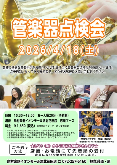 【4/18(土)開催】楽器の健康診断しませんか?管楽器点検会を開催します!※3/18(水)からご予約開始!