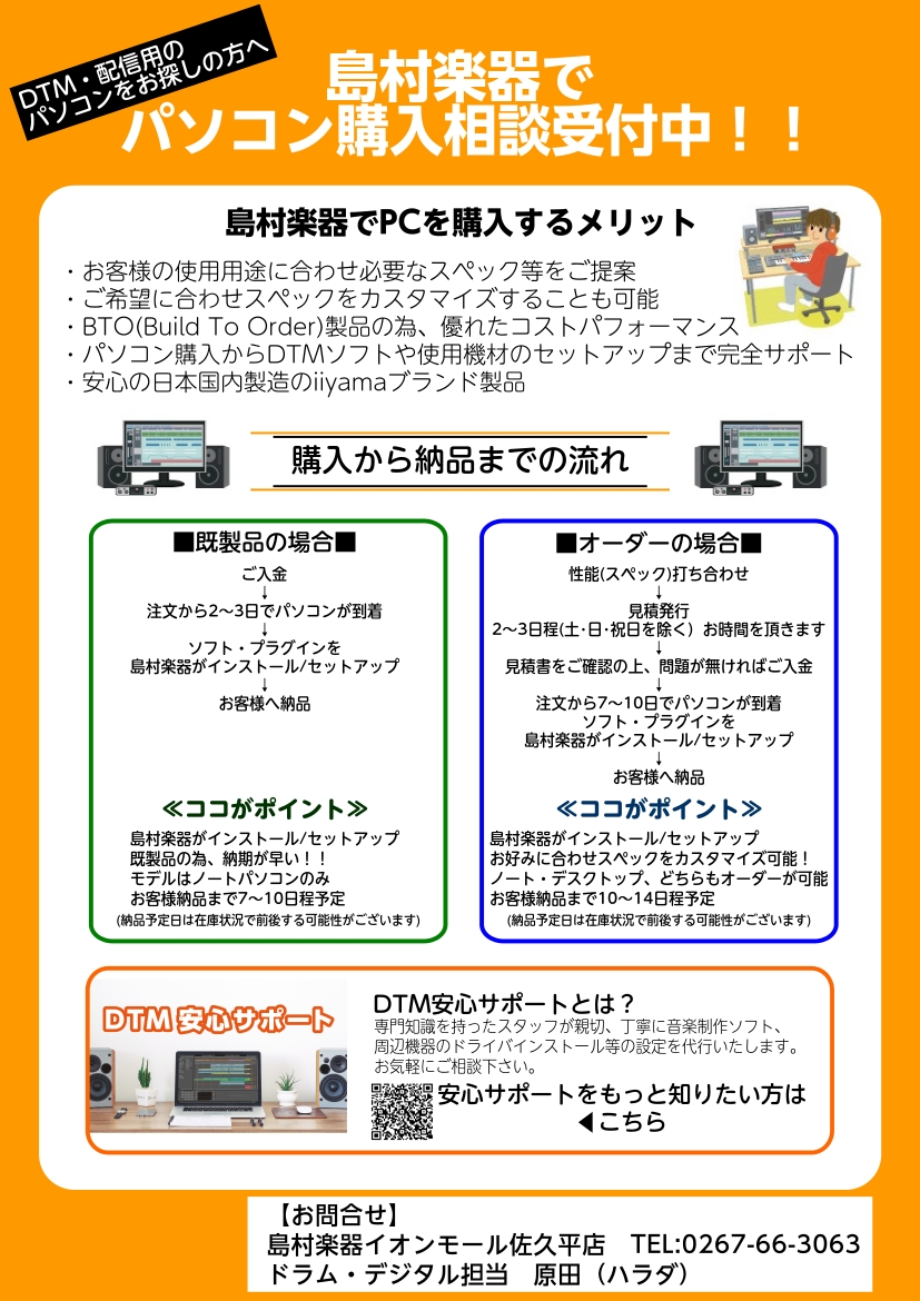 島村楽器イオンモール佐久平店では、これからDTM、PCでの宅録、配信等々を始めようとお考えの方、PCを新調しようとお考えの方向けにパソコンの販売、オーダーを承っております!ご興味がある方はお気軽に島村楽器イオンモール佐久平店へお問い合わせください!