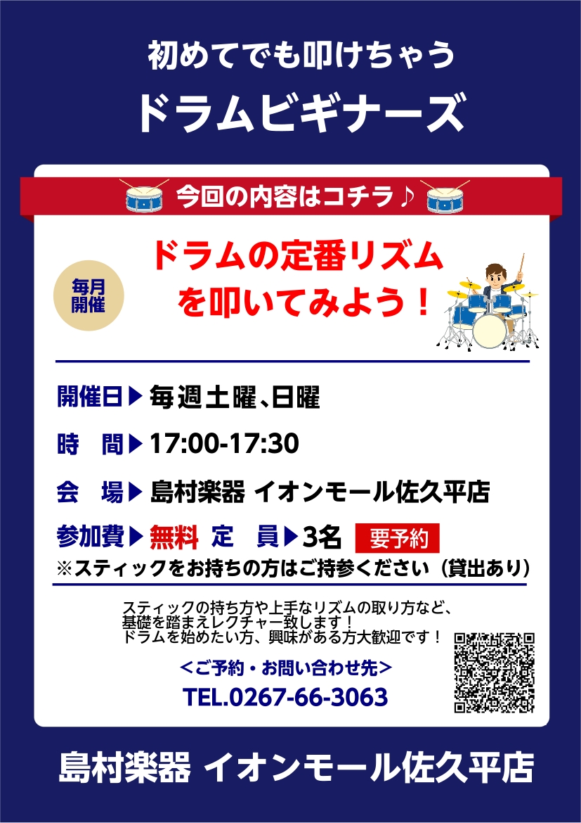 イオンモール佐久平店ではドラムをやってみたい・始めたい・興味のある方へ30分程度のドラム・リズム体験を提供しております!