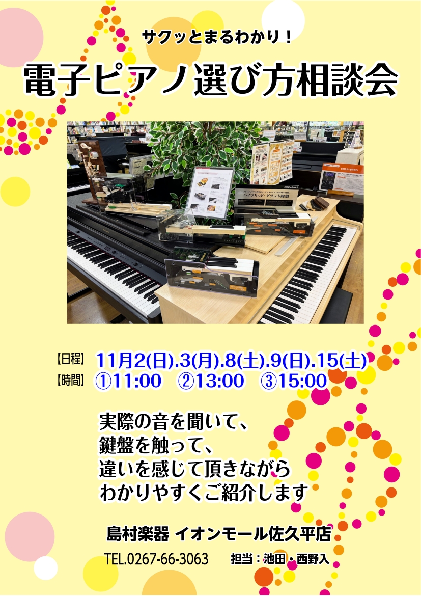 ![島村楽器イオンモール佐久平店では、電子ピアノ選びに悩むお客様向けに「電子ピアノの選び方 相談(無料)」を実施しています。お子さまの初めてのピアノ、ご家族の趣味、クリスマスプレゼントやブラックフライデーでご検討の方、など、目的に合わせて“ぴったりの1台”をご提案いたします。長野県で電子ピアノを検討され […]](https://www.shimamura.co.jp/shop/sakudaira/wp-content/uploads/sites/48/2025/02/20251026-shima251026-0127.jpg)