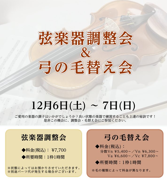 ⑤【定員に達しましたため受け付けを締め切らせていただきます】弦楽器調整会&弓の毛替え
