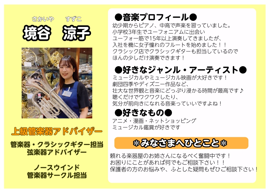 上級管楽器アドバイザー境谷 涼子(さかいや すずこ)