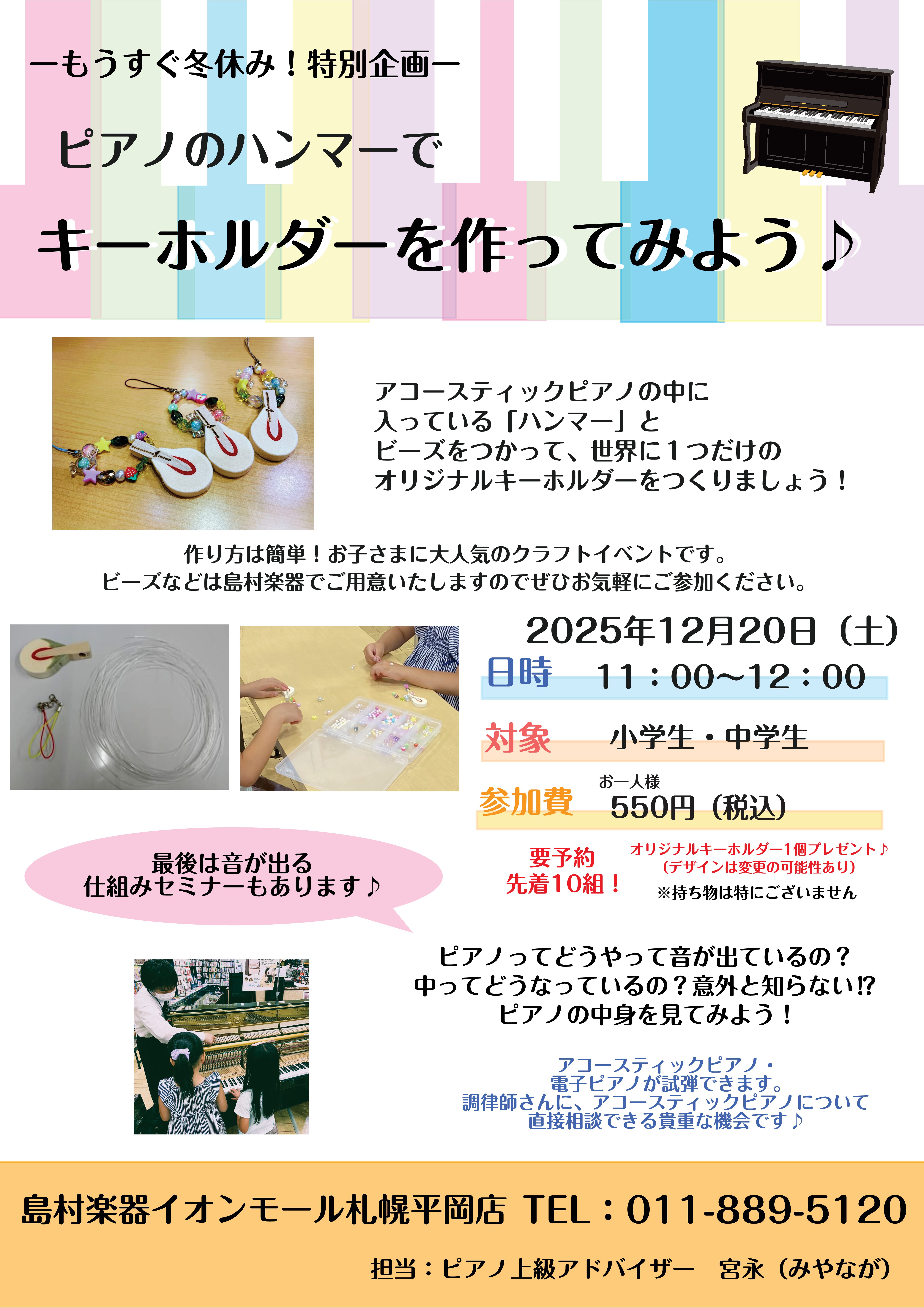 ![アコースティックピアノの中に入っている「ハンマー」とビーズを使って、世界に一つだけのオリジナルキーホルダーをつくりましょう! 作り方はとっても簡単!お子様に大人気のクラフトイベントです。ビーズなどは島村楽器でご用意いたしますので、是非お気軽にご参加ください♪ CONTENTSイベント概要イベント詳細 […]](https://www.shimamura.co.jp/shop/sapporo-h/wp-content/uploads/sites/10/2024/07/20240709-img_6515.jpg)