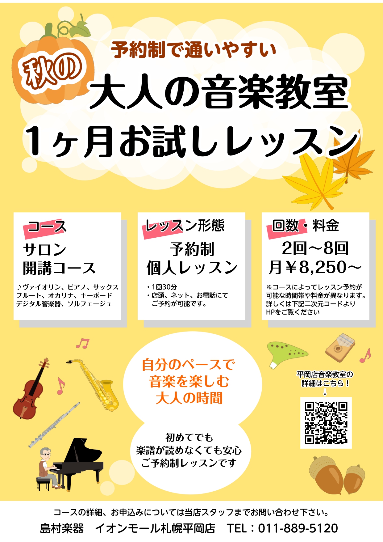 ![CONTENTS入会金なし!1ヶ月お試しレッスン開講中!お試しレッスンとは?こんな方にオススメ!開講コース レッスン概要入会金なし!1ヶ月お試しレッスン開講中! 島村楽器イオンモール札幌平岡店のミージックサロンでは、入会金不要!の1ヶ月お試しレッスンを開講中です。高校生以上であればどなたでも受講して […]](https://www.shimamura.co.jp/shop/sapporo-h/wp-content/uploads/sites/10/2025/11/20251106-shima251106-0199.jpg)