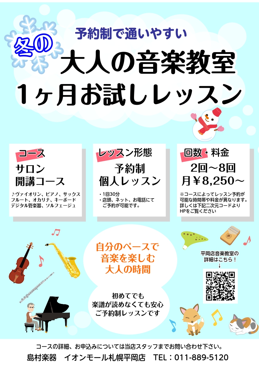 ![CONTENTS入会金なし!1ヶ月お試しレッスン開講中!お試しレッスンとは?こんな方にオススメ!開講コース レッスン概要入会金なし!1ヶ月お試しレッスン開講中! 島村楽器イオンモール札幌平岡店のミージックサロンでは、入会金不要!の1ヶ月お試しレッスンを開講中です。高校生以上であればどなたでも受講して […]](https://www.shimamura.co.jp/shop/sapporo-h/wp-content/uploads/sites/10/2025/11/20251122-shima251122-0206.jpg)