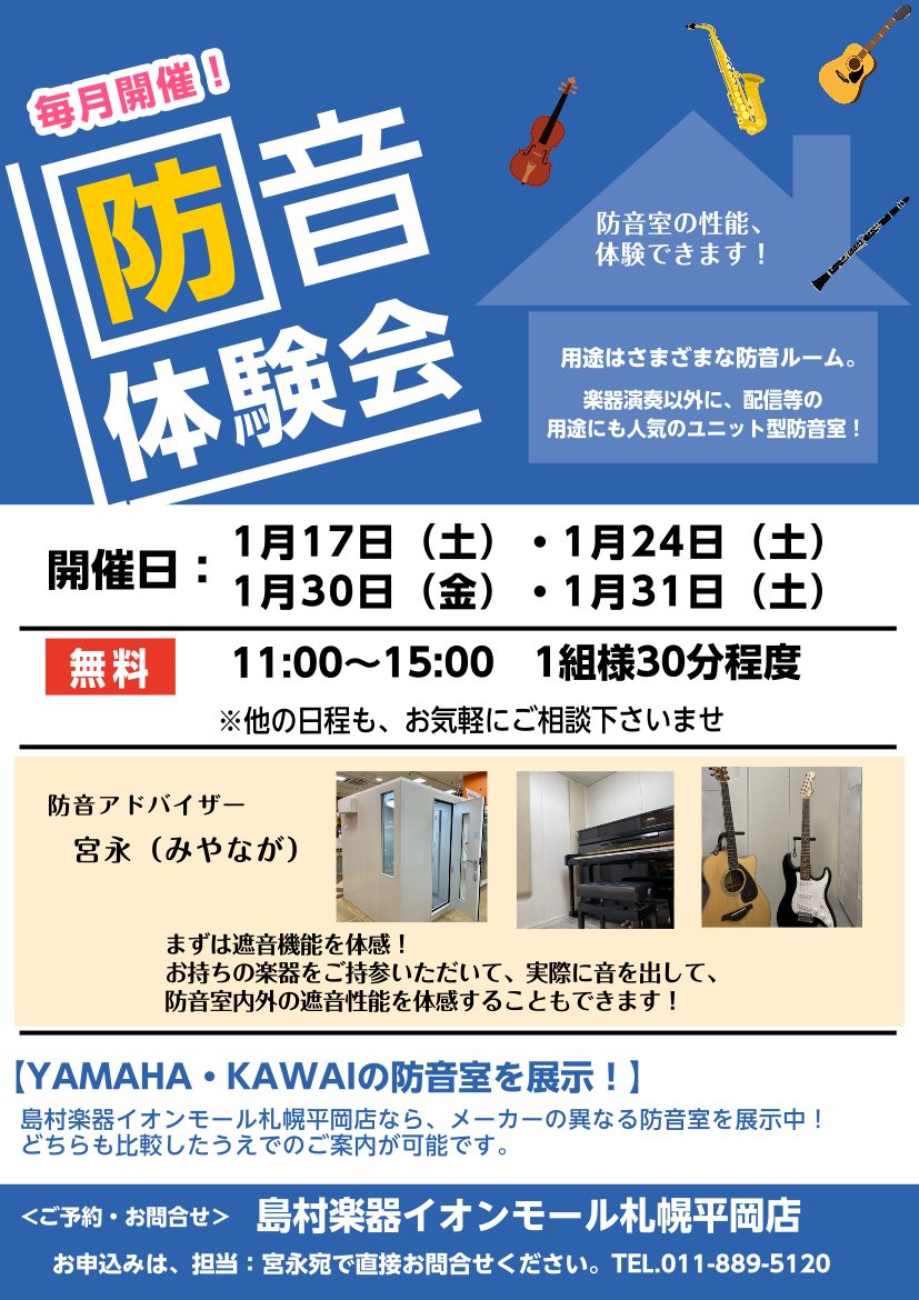 ![CONTENTS個別の『防音体験会』を定期開催しています!防音体験会日程お申込みはこちら2025年1月スケジュール(10:00-16:00)防音室の選び方はこちら!(防音情報総合ページ)お得な情報はこちら!個別の『防音体験会』を定期開催しています! 島村楽器イオンモール札幌平岡店『防音アドバイザー』 […]](https://www.shimamura.co.jp/shop/sapporo-h/wp-content/uploads/sites/10/2024/05/20250423-60b34a4ec338cf35d1f836a0b3b3dd73.png)