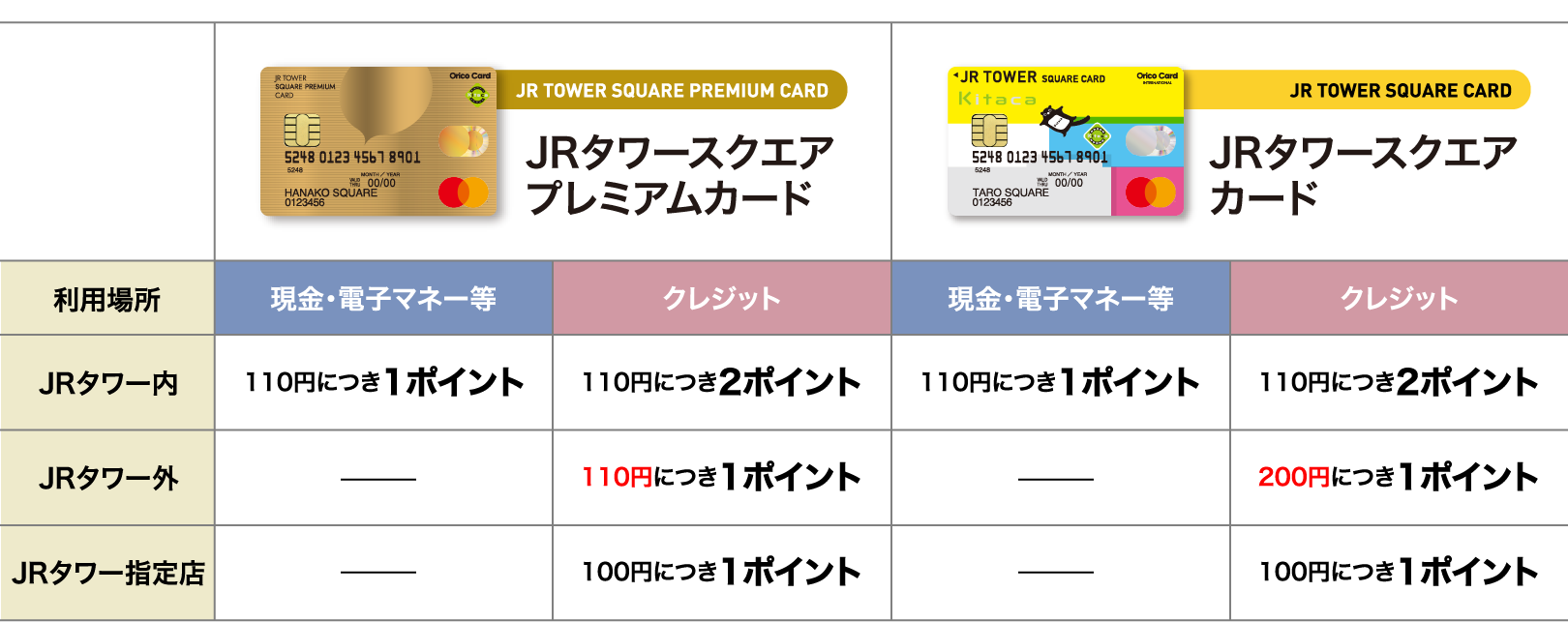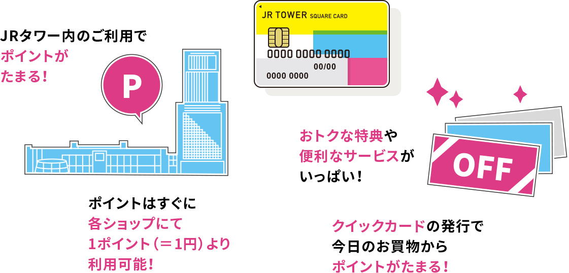 JRタワースクエアカードは、JRタワー4エリア内約560ショップでポイントが付くほか、カード会員だけの特典、サービスもいっぱいのおトクなカードです。
